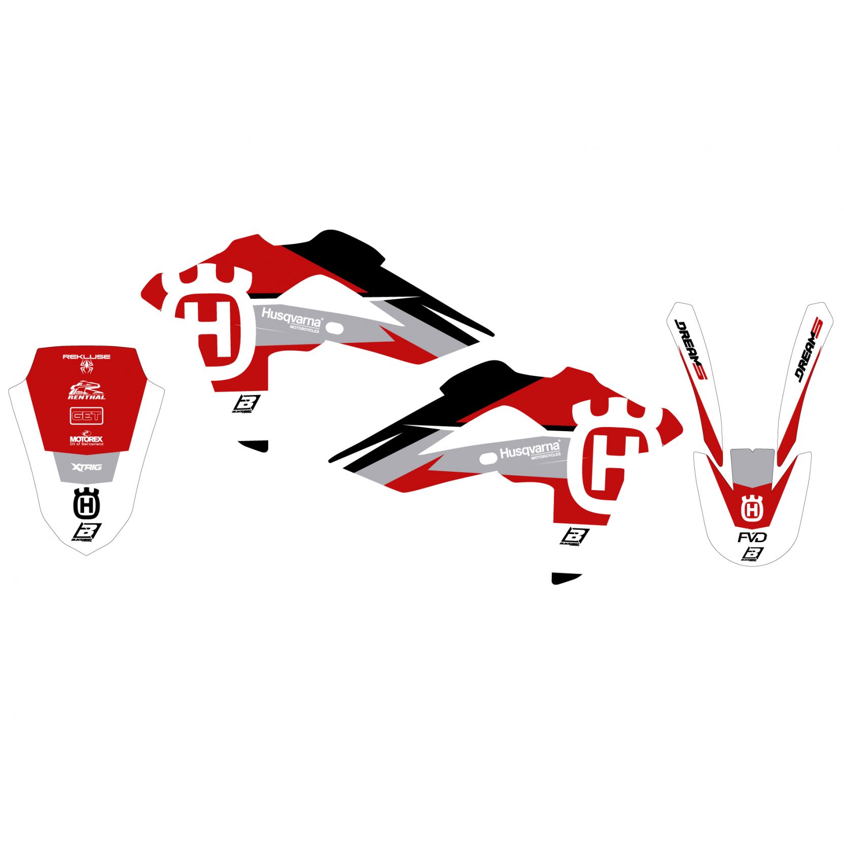 The RED DREAM 5 Graphic Kit is designed for a range of Husqvarna off-road motorcycles, providing decal coverage for essential body panels. This kit includes decals for the radiator shrouds ( adaptable ), front fender and rear fender