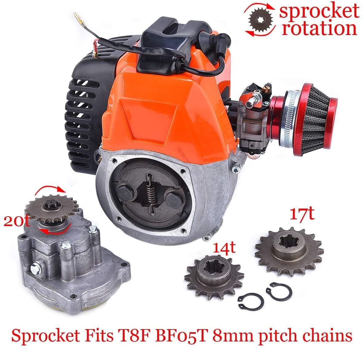 The 49cc 2-Stroke Gas Scooter Engine Throttle Cable and Grip Kit is a compact yet powerful solution for a variety of scooters, pocket bikes, mini choppers, and mini quad ATVs. Featuring a built-in square exhaust muffler, centrifugal clutch, and gearbox, this engine kit is designed for versatility and performance. It includes three sprockets (14T, 17T, and 20T) to fit T8F BF05T 8mm pitch chains, offering multiple ratio and speed options to suit different applications.