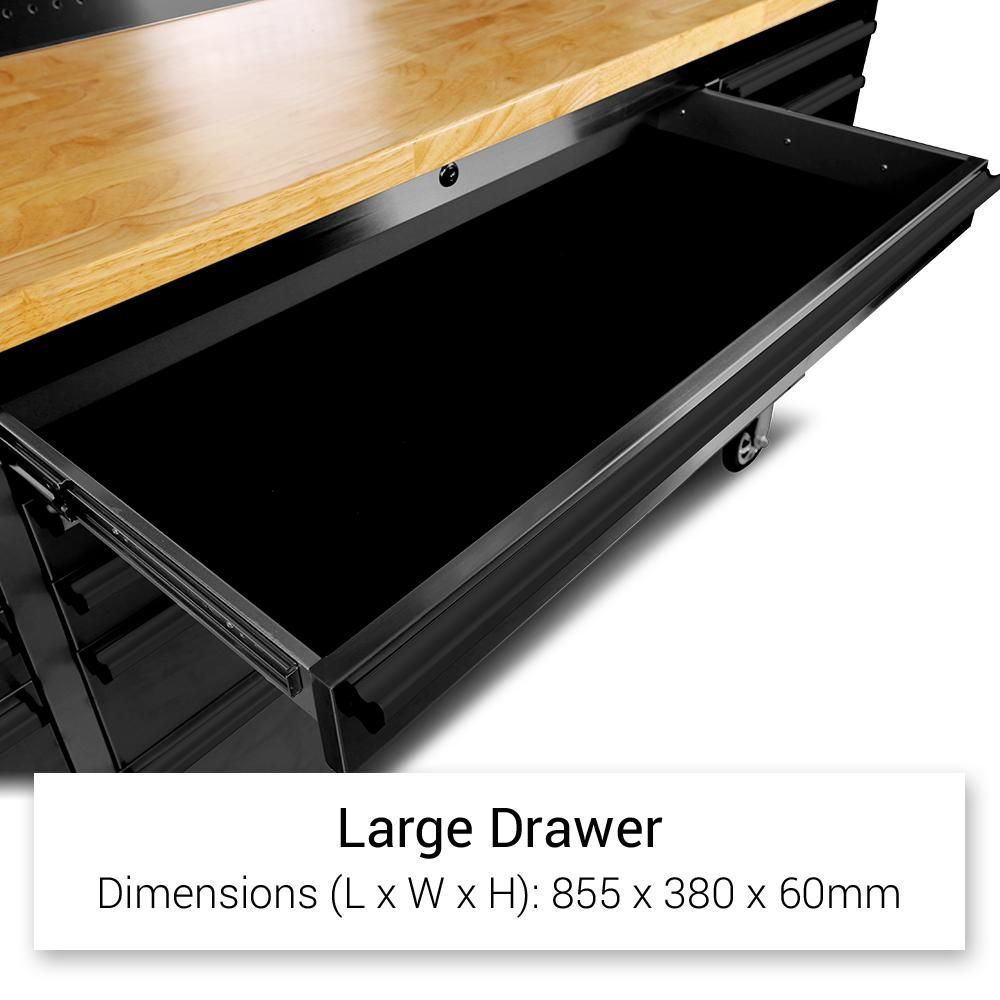With fifteen drawers equipped with full-extension slides and anti-slip liners, you’ll have ample space and accessibility for all your tools. The three large upper cabinets offer additional storage, and the stainless steel pegboard allows you to hang tools for quick and easy access.