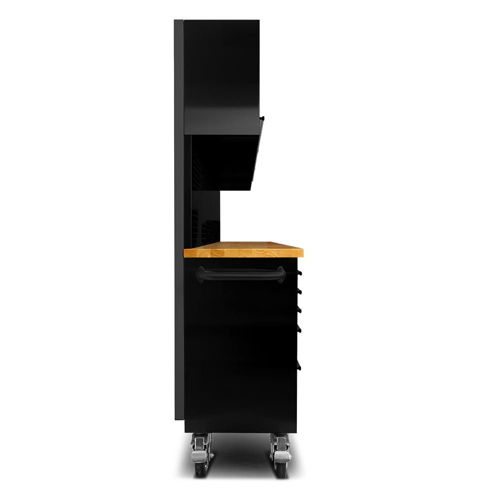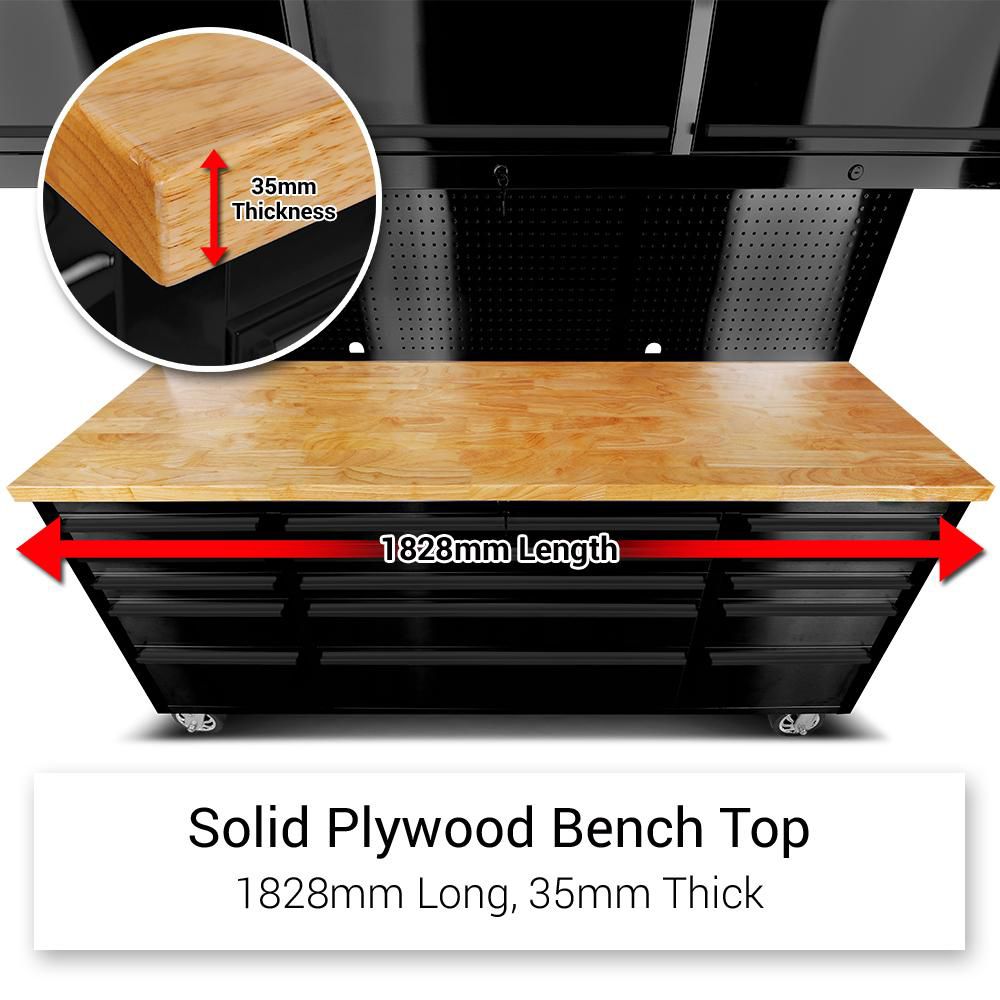 72″ Matte Black Steel 15 Drawer Tool Chest with Solid Wooden Top, 3 Upper Cabinets and Peg Board