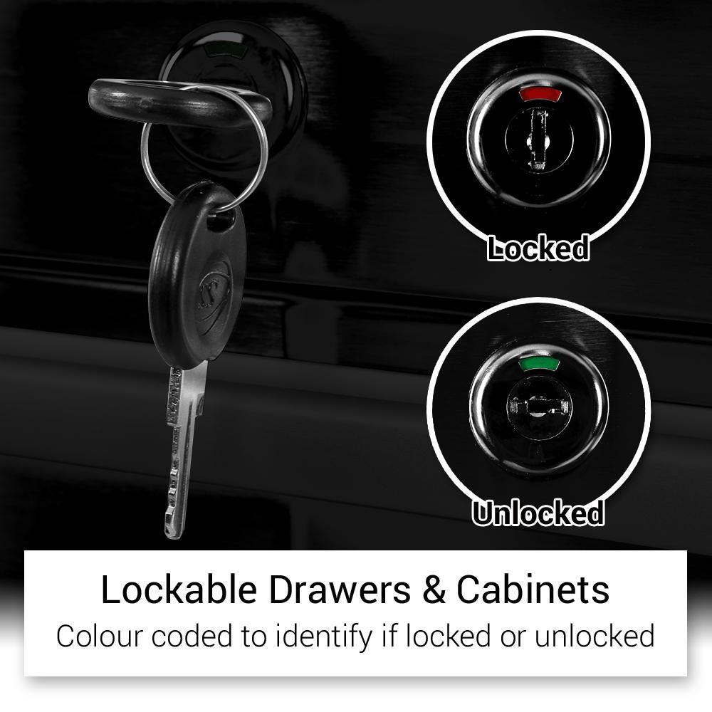Whether you’re working in an automotive shop, an art studio, or any other professional setting, this workbench is built to handle the job with a 100-lb drawer capacity and heavy-duty construction. The central flat key locking system adds a layer of security, ensuring your tools are safe and secure.