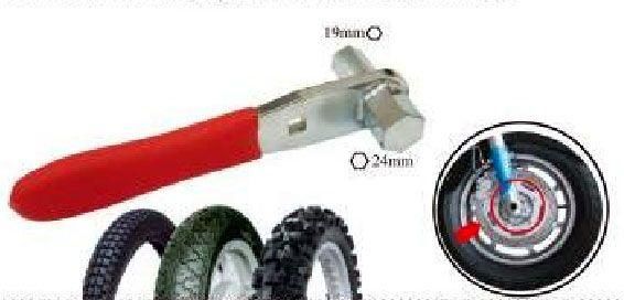 An ideal tool to install and remove front wheel axles and swing arm pivot shafts. Double sided 19mm and 24mm hex. It also provides a 3/8 square drive hole in the handle for easy torque adjustments.