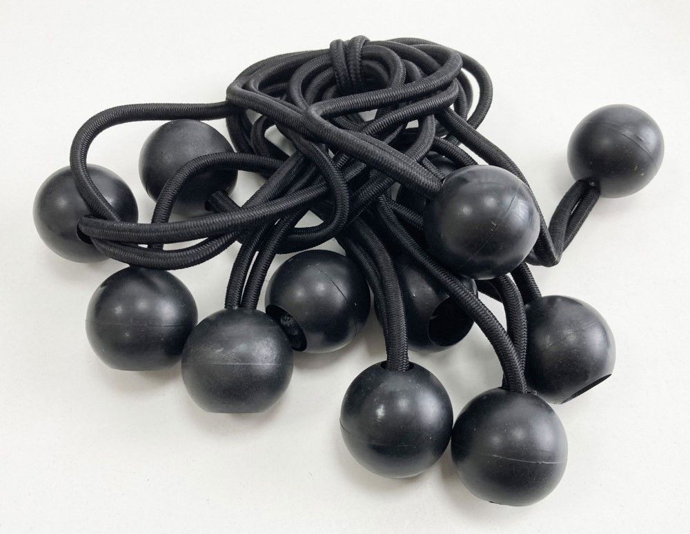 This set includes 12 ball bungees, each with a 6-inch (20 cm) loop length. The loops are designed to easily stretch to twice their original size. These bungees are suitable for securing tarpaulins. Full product dimensions are 12 x 14 x 5 cm.