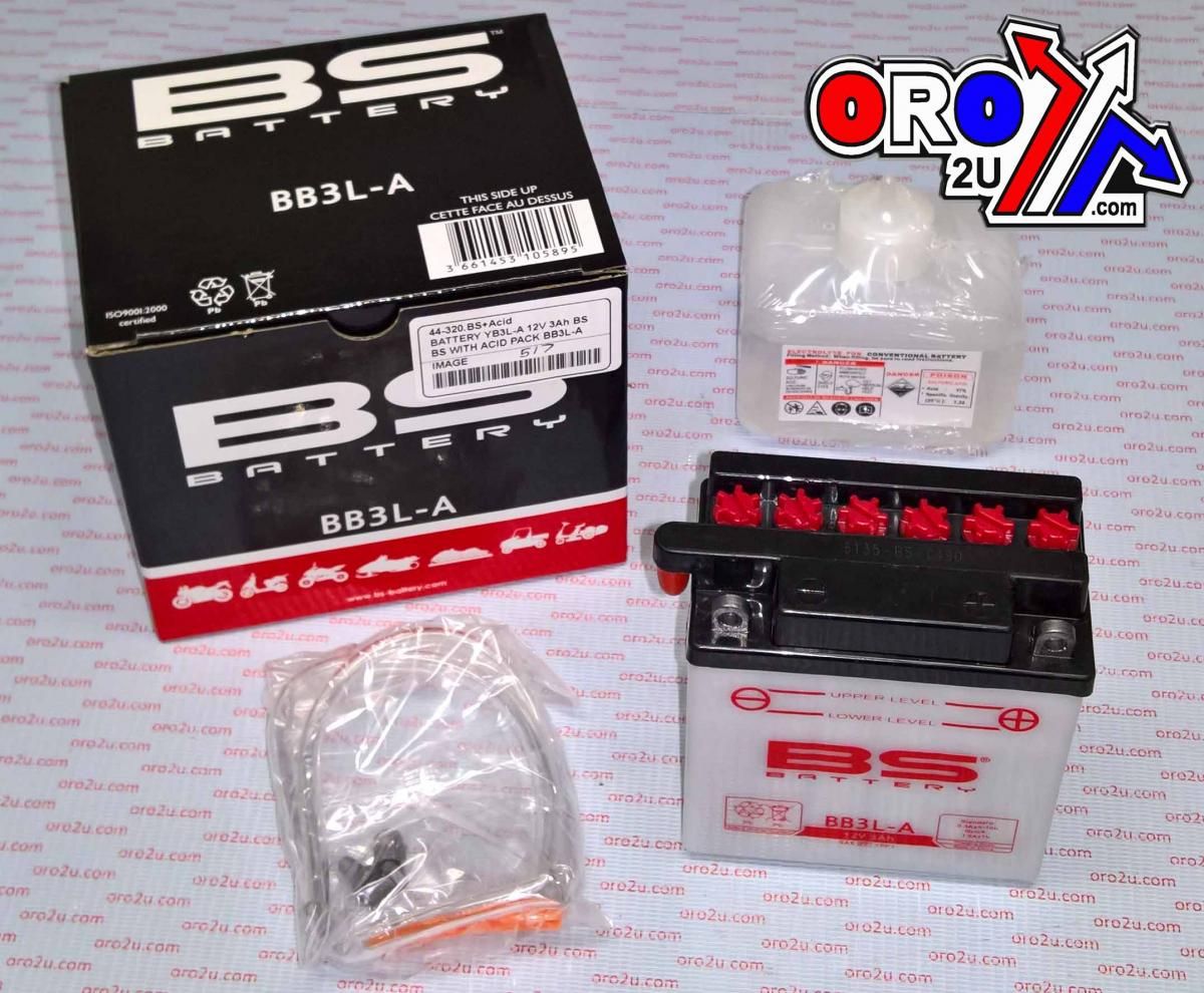 BB3L-A 12V 3Ah. BS BATTERY With Acid Pack. [YB3L-A] SIZE. 98 x 56 x 110 [Polarity -/+] Conventional introduction Cooventional batteries are lead acid flooded batteries. These batteries need to be filled before first use.