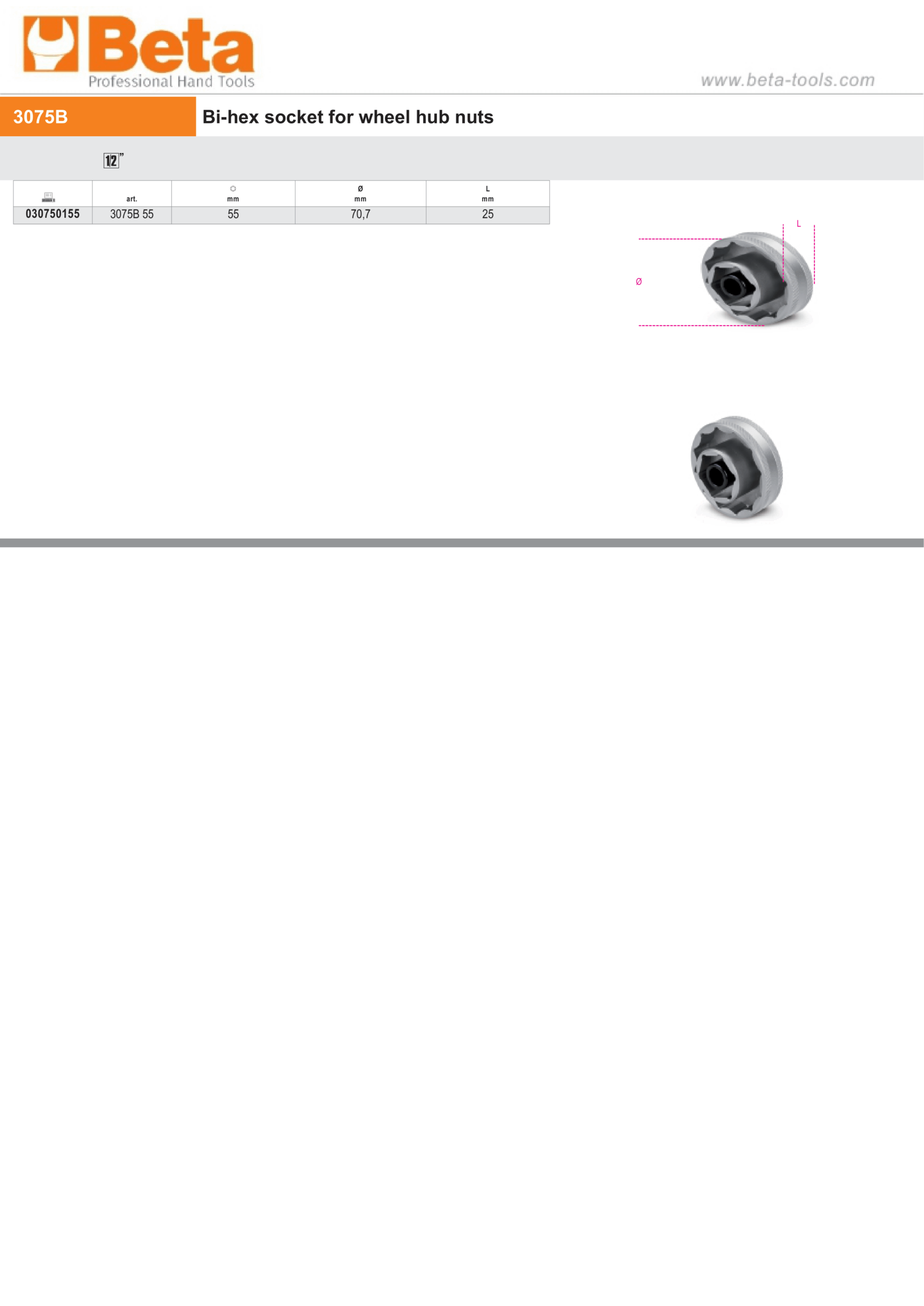 The Beta Tools Bi-Hex Socket for Wheel Hub Nuts – Model 3075B 55 is a high-performance tool designed for the precise handling of 55 mm wheel hub nuts. This bi-hex socket is essential for ensuring secure and efficient maintenance of vehicle wheel hubs, making it an invaluable tool for both professional mechanics and automotive enthusiasts.