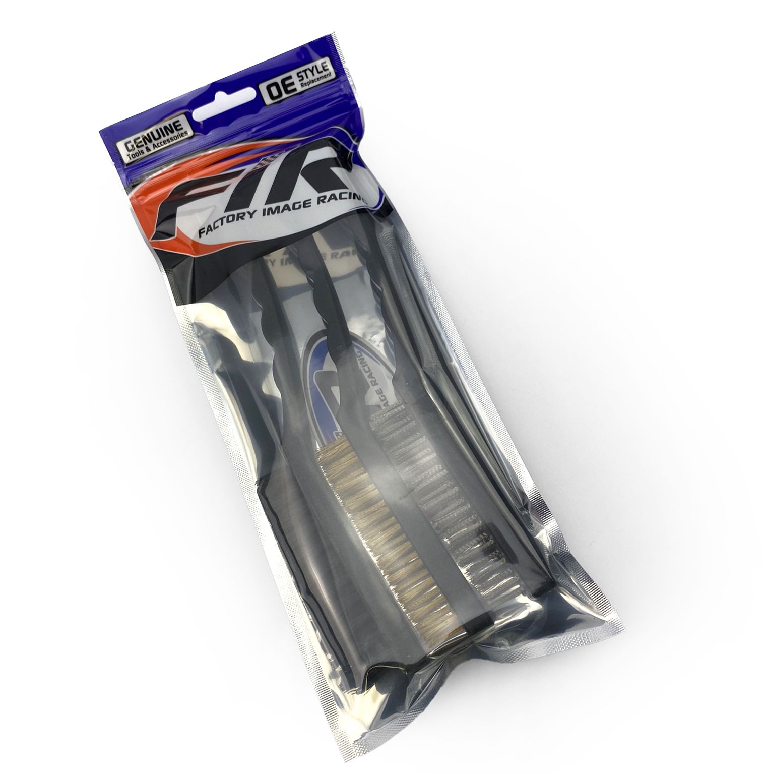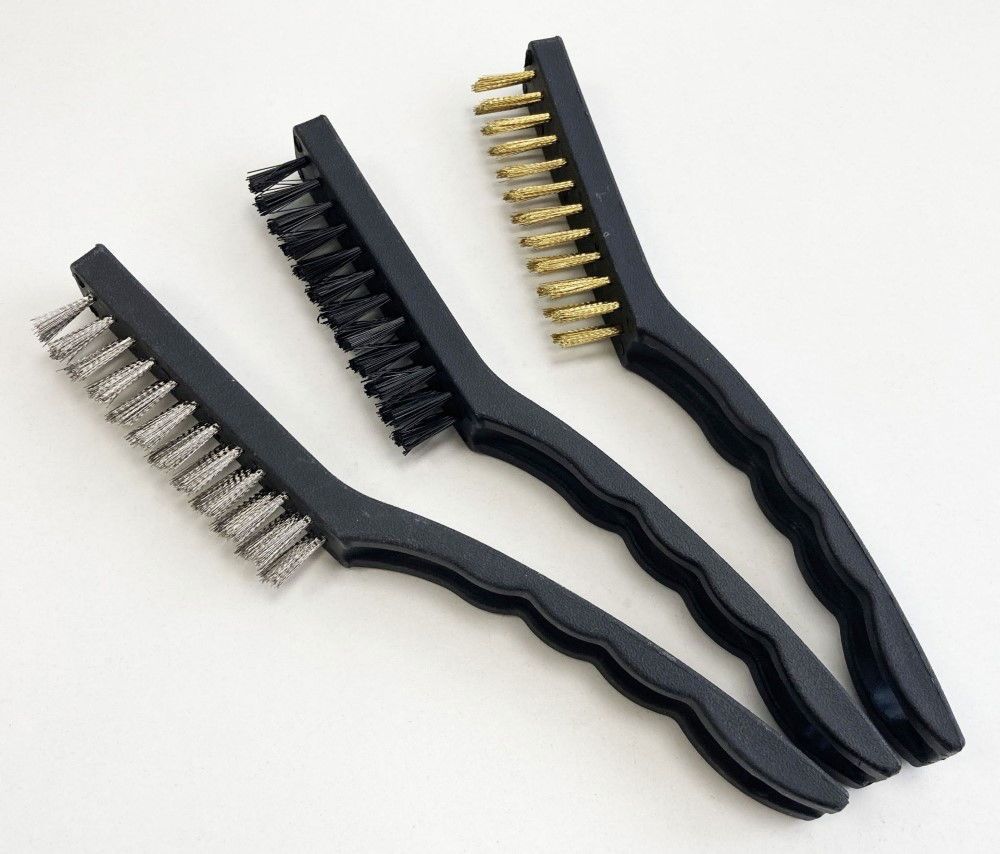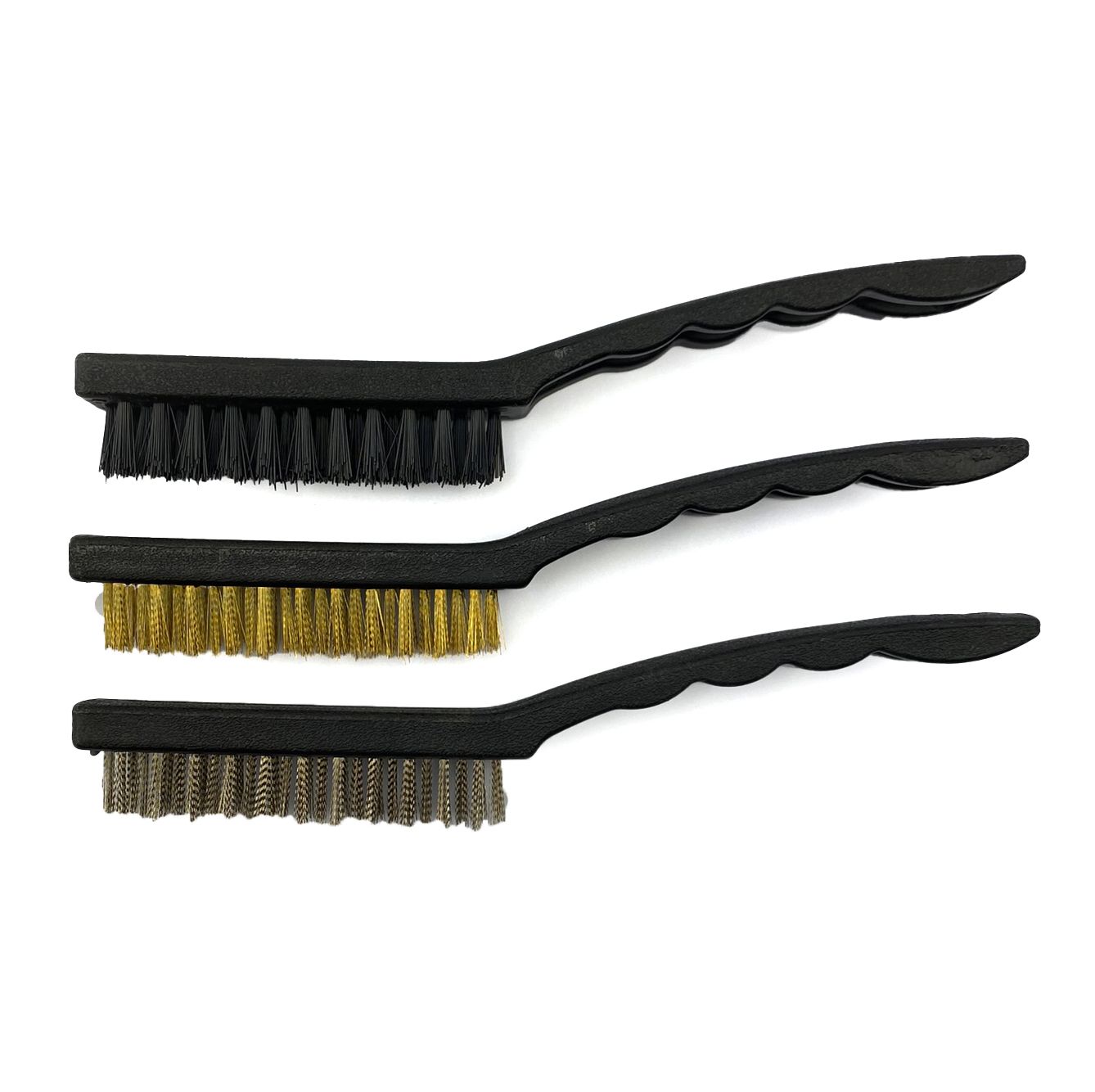This 3-piece set of 9-inch bristle brushes includes brushes with brass-coated, stiff nylon, and steel bristles. Each brush features a solid black plastic handle with a gently curved design for improved grip and comfort.