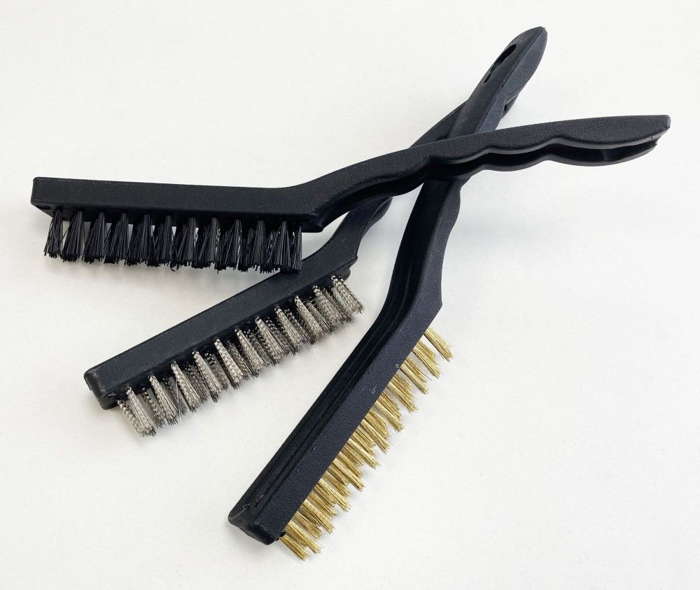 - Brush types: brass-coated, stiff nylon, and steel bristles