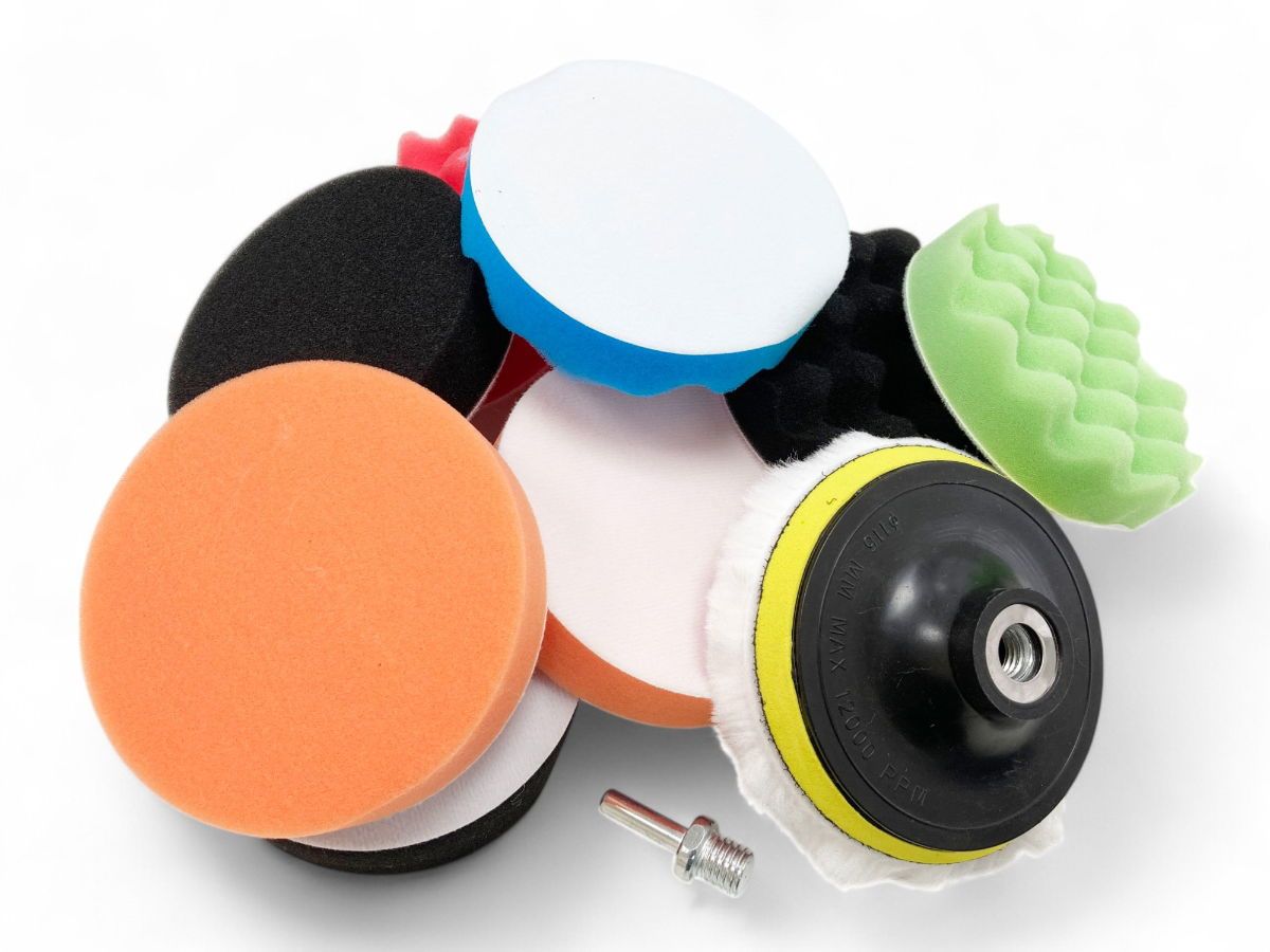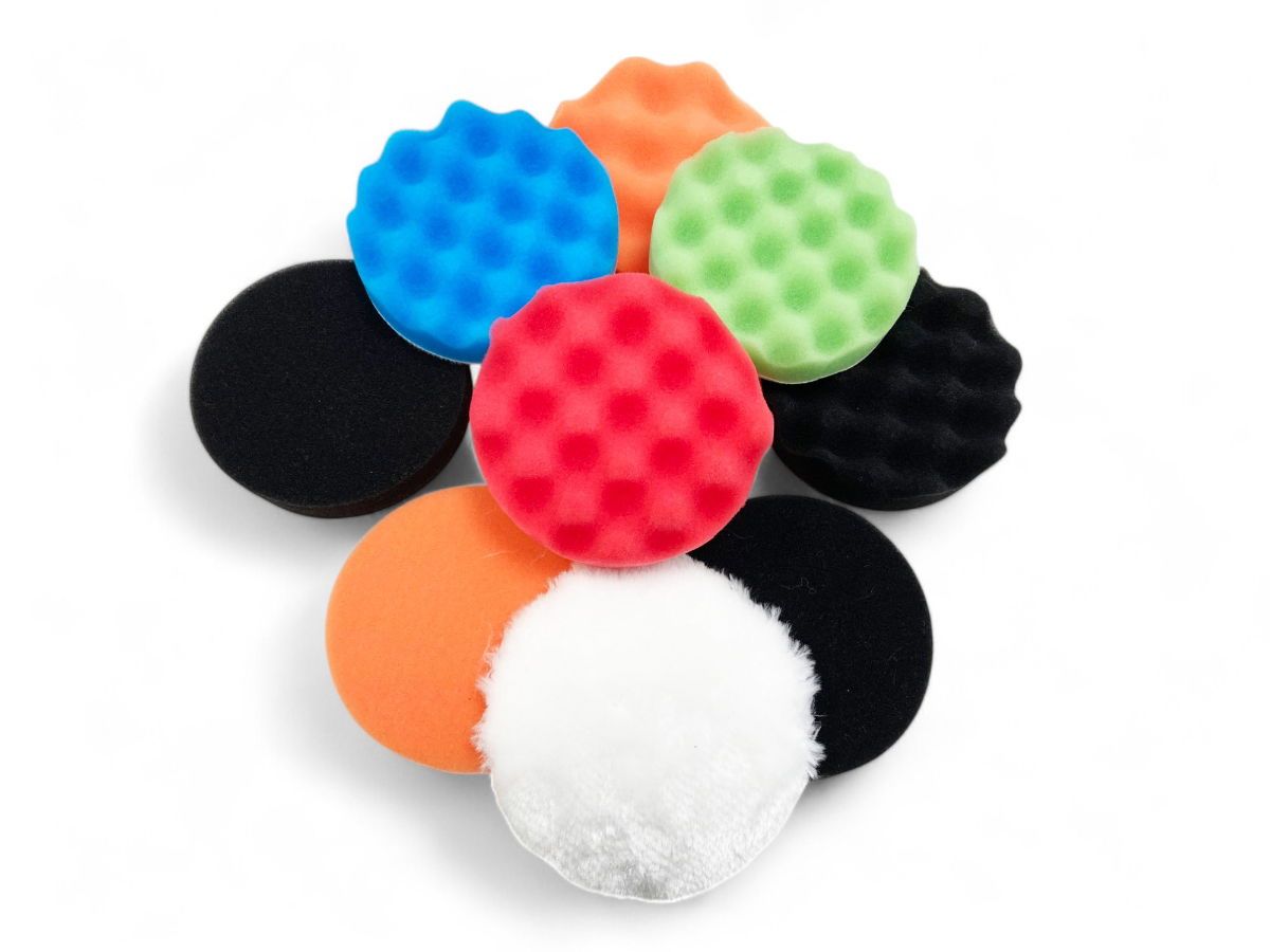 - Equipped with a mix of flat and waffle foam pads, as well as a polyester polishing pad