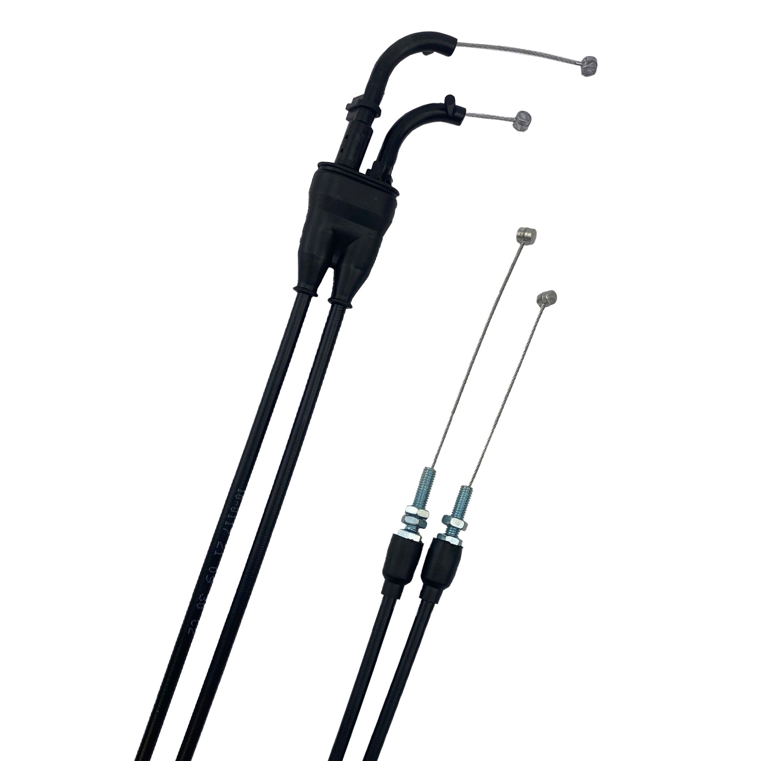 This push/pull throttle cable set includes both push and pull cables, designed with black vinyl coil-wound housings and inner nylon sleeves to ensure long service life and smooth throttle response. Built to meet or exceed OEM quality standards, it is compatible with a wide range of KTM and Husaberg models equipped with Keihin FCR carburettors and Domino throttle kits.