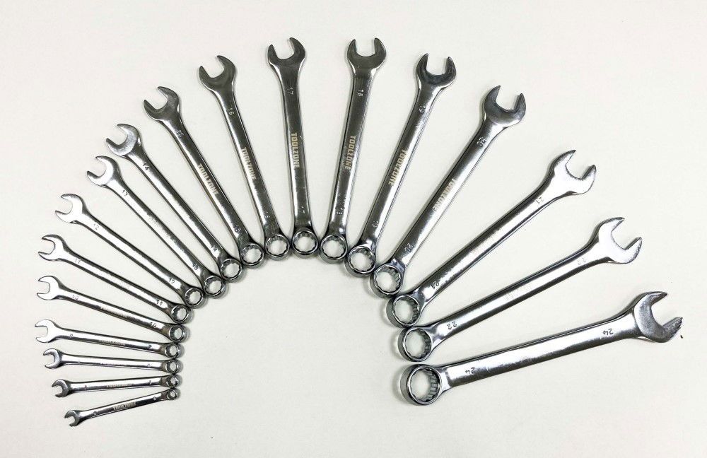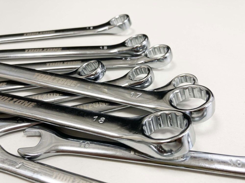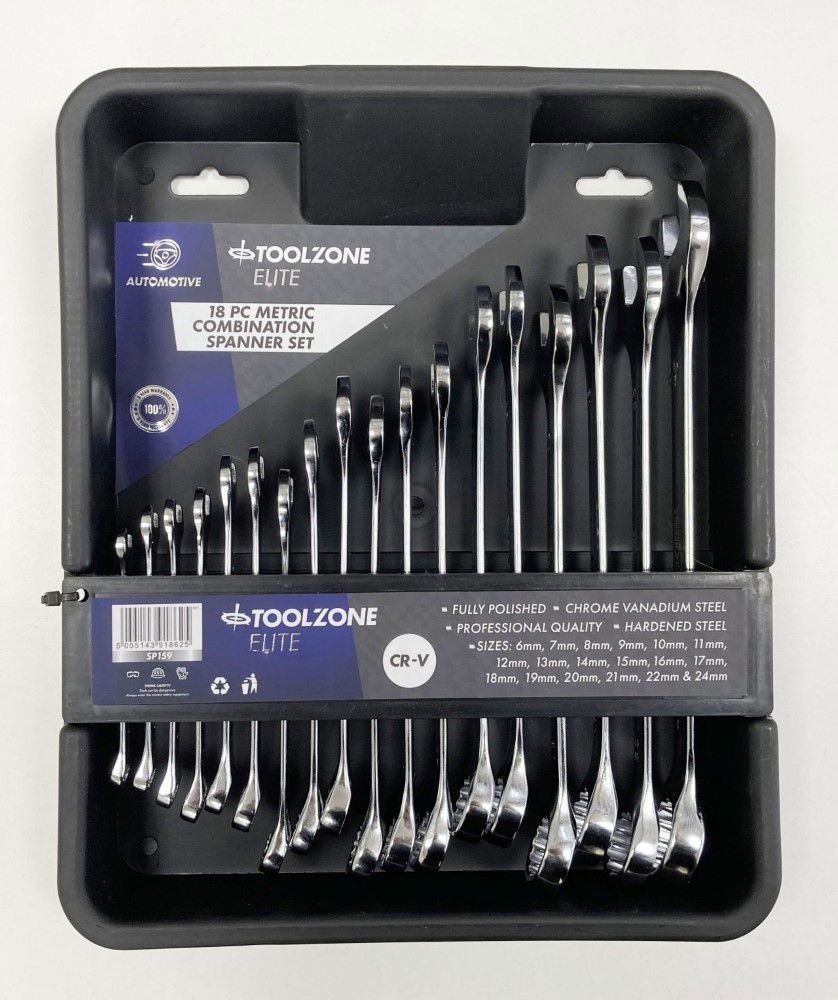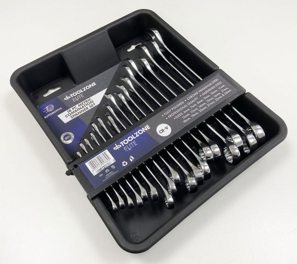 This 18-piece metric combination spanner set is constructed from hardened and tempered chrome vanadium steel with a polished finish. The set is supplied in a heavy duty tray suitable for placement inside tool cabinet drawers.