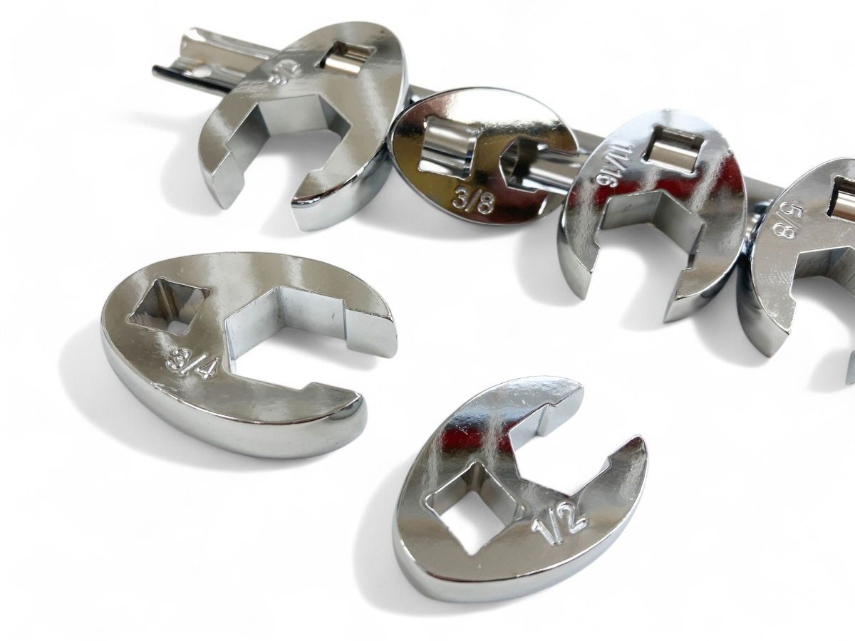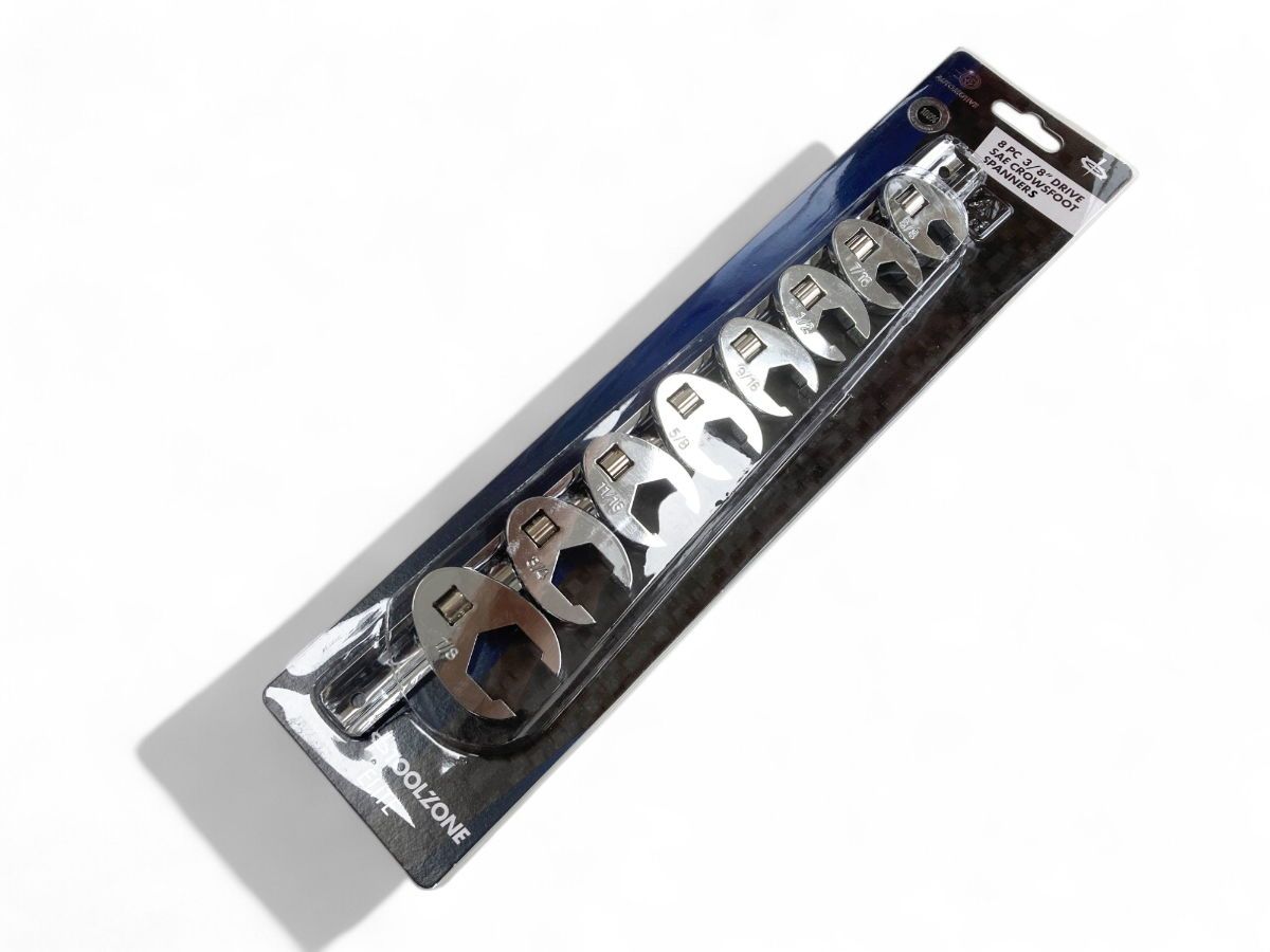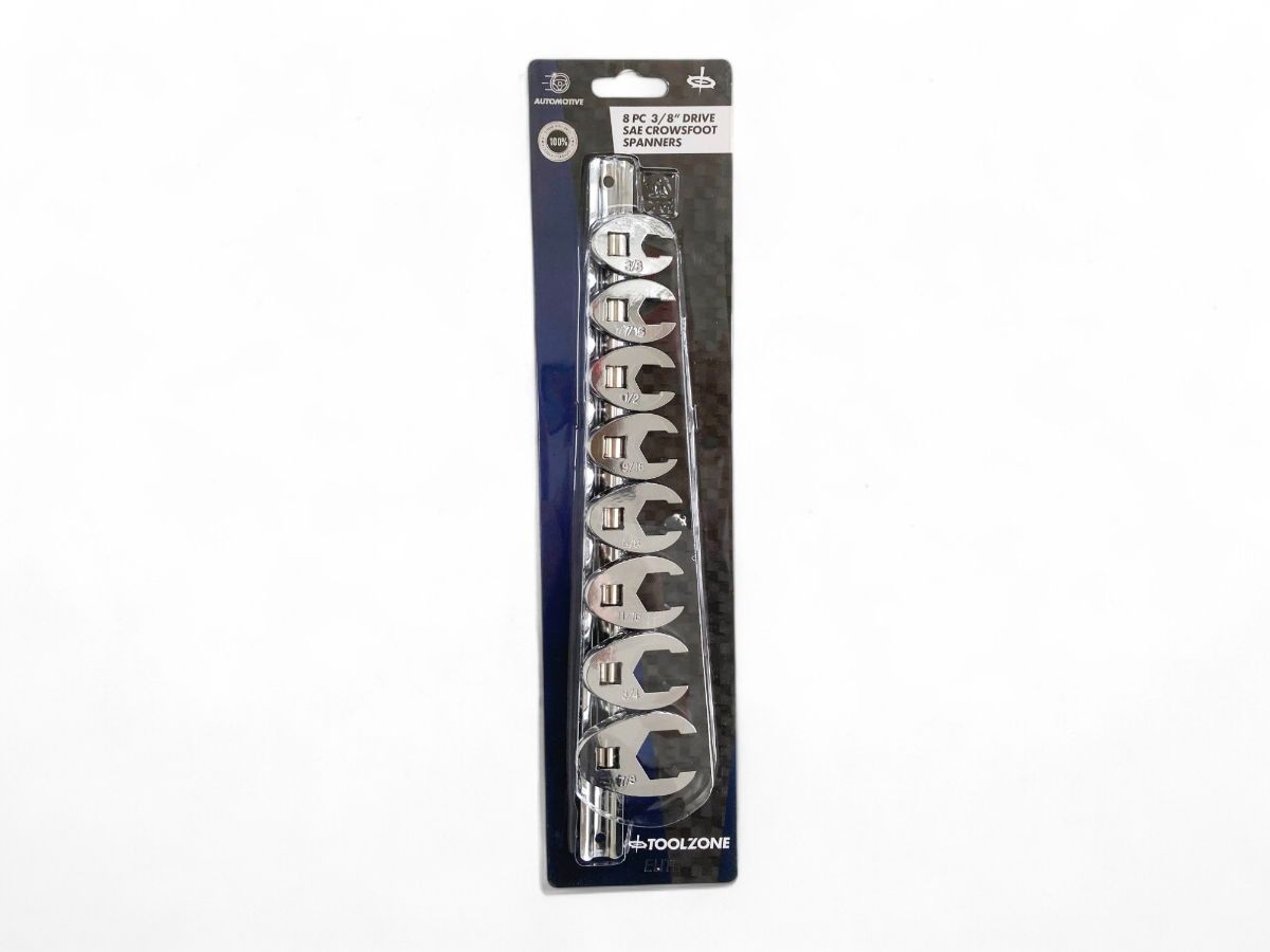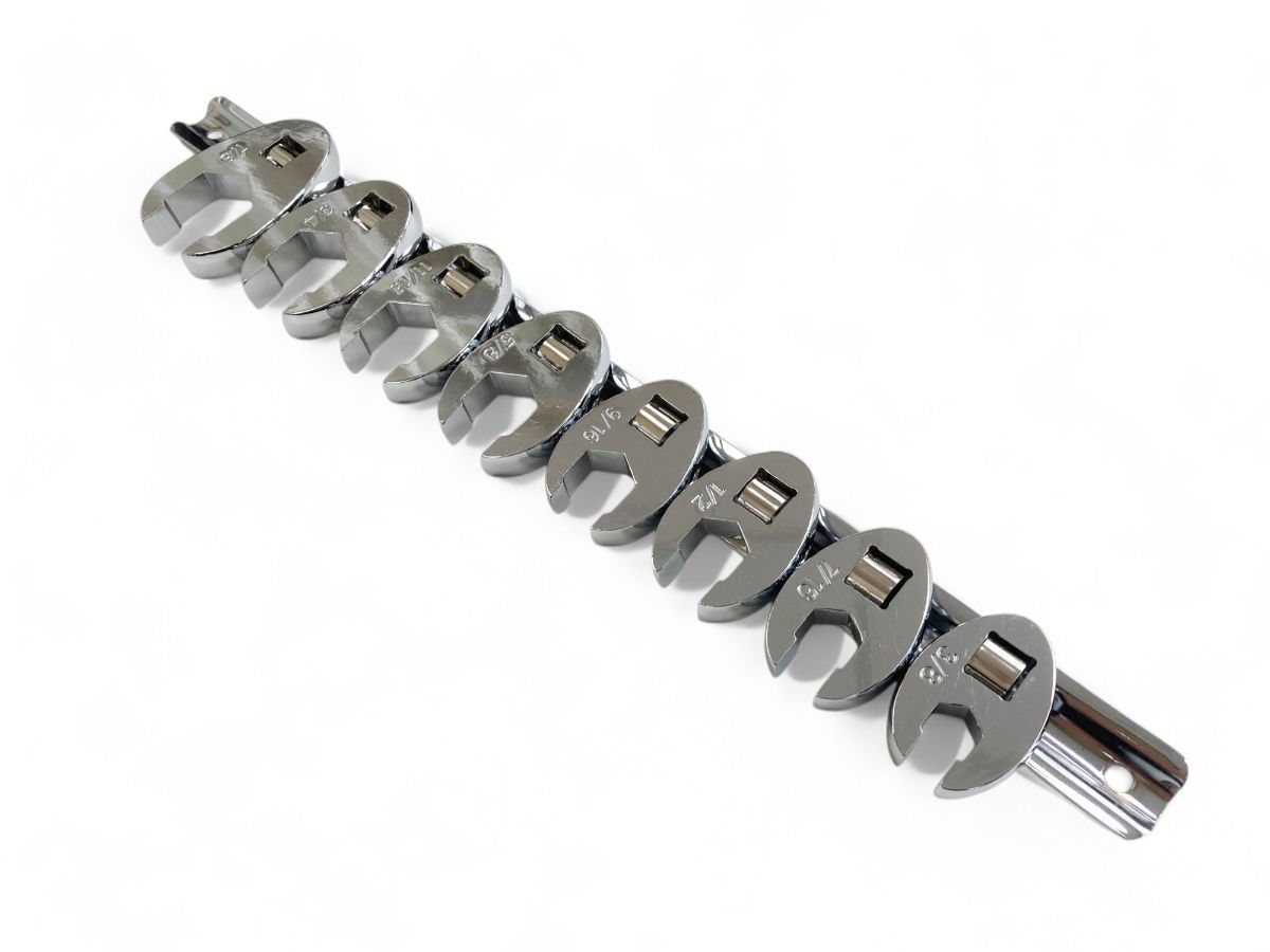 This 8-piece imperial crowsfoot spanner set is made from chrome vanadium steel and comes mounted on a storage rail. The set includes commonly used imperial sizes.