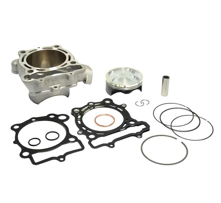 The kit includes the high-quality aluminum cylinder with increased bore, the complete piston with the piston pin and rings, and all the necessary gaskets.