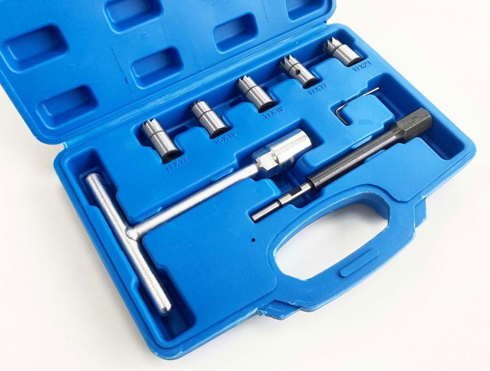 This 7-piece diesel injector cutter set is designed for cleaning and decarbonising injector seats. The set includes various sizes of flat and angled reamers, a T-handle socket extension, a reamer holder, and is supplied in a storage case.