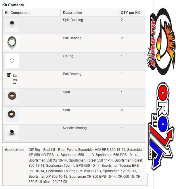 Differential Bearing and Seal Kit Rear Polaris SCRAMBLER 1000 XP HO EPS 14-17, Scrambler 850 15-17, Scrambler HO/ EPS 850 13-14, Sportsman 1000 XP 15-17, Sportsman 550 11-13, Sportsman 550 EPS 10-14, Sportsman 550 X2 10-14, Sportsman 550 XP 13-14, Sportsman 850 SP 15-17, Sportsman 850 WV 14, Sportsman Forest 550 11-14, Sportsman Forest 850 11-15, Sportsman Touring 850 SP 15, Sportsman Touring EPS 550 10-14, Sportsman Touring EPS 850 10-14, Sportsman Touring EPS 850 HO 13, Sportsman X2 850 11, Sportsman XP 550 10, Sportsman XP 550 Built after 12/1/08 09, Sportsman XP 850 10-13, Sportsman XP 850 EPS 10-14