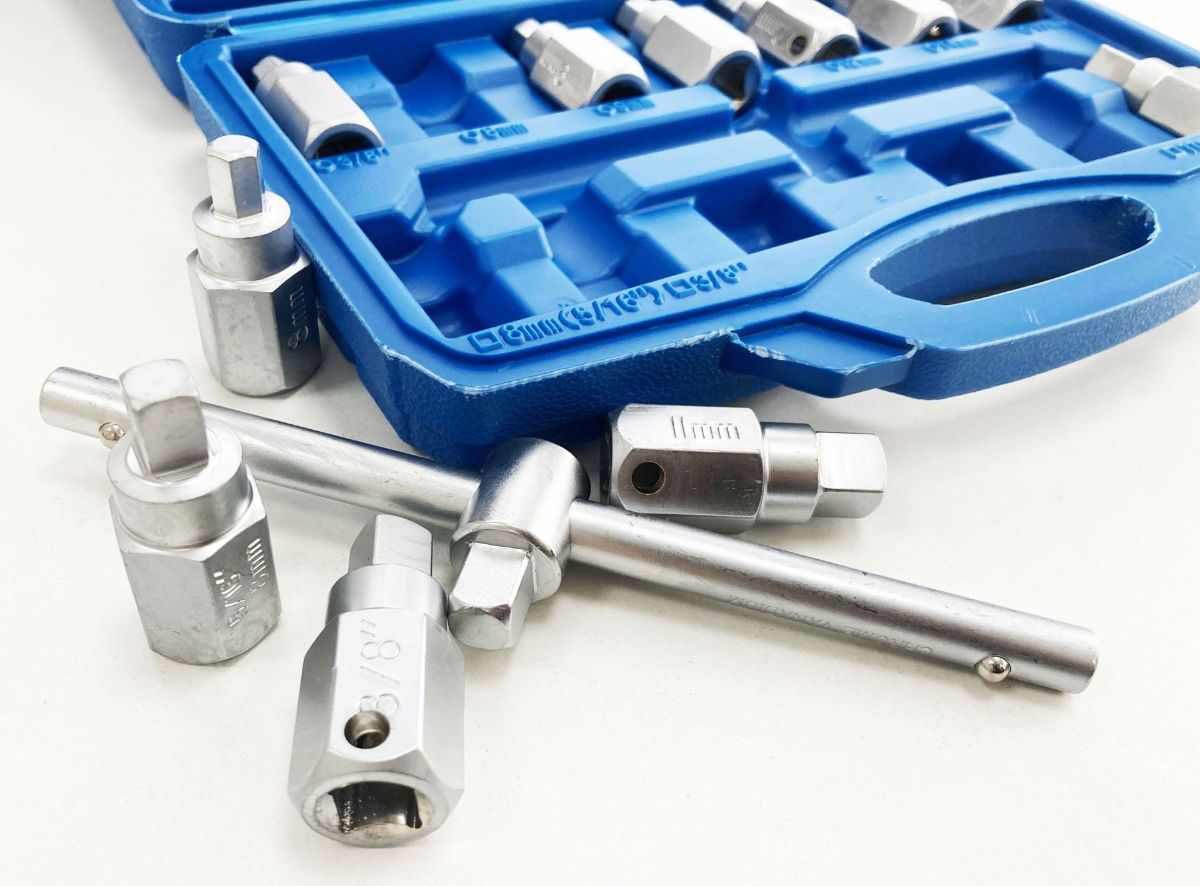 This 12-piece drain plug key set is constructed from chrome vanadium steel and includes a range of hex and square bits for various drain plug applications. A tommy bar is provided for use with the bits.
