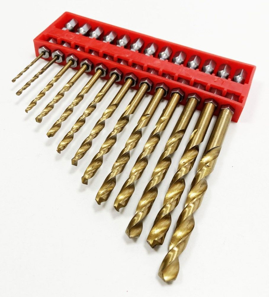 - Thirteen-piece titanium coated high speed steel drill bit set
