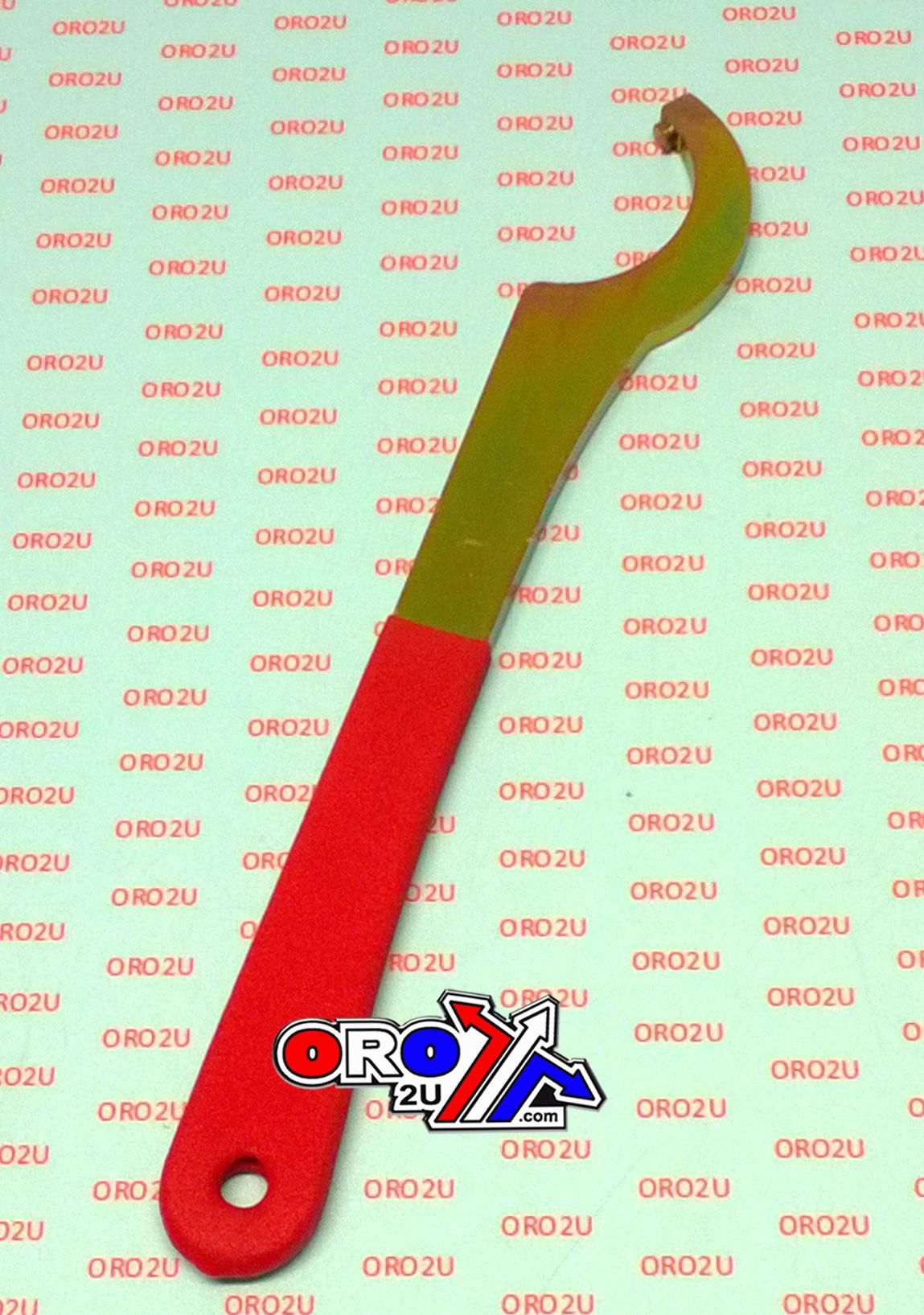 The pin and arched shape of the wrench head are specifically configured to line up to the holes on the nut at the end of the exhaust pipe where it enters the cylinder head, providing ample leverage to loosen or reinstall exhaust nuts in routine maintenance situations. The wrench is 225mm in length and made of steel.
