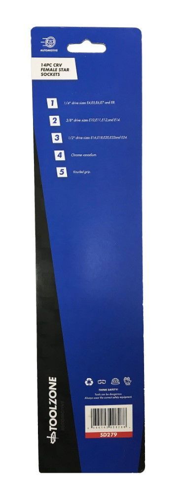 This 14-piece female star socket set includes a comprehensive range of sizes for 1/4″, 3/8″, and 1/2″ drive tools. Each socket is constructed from chrome vanadium steel with a knurled grip for secure handling, and the set is supplied with a storage rail.
