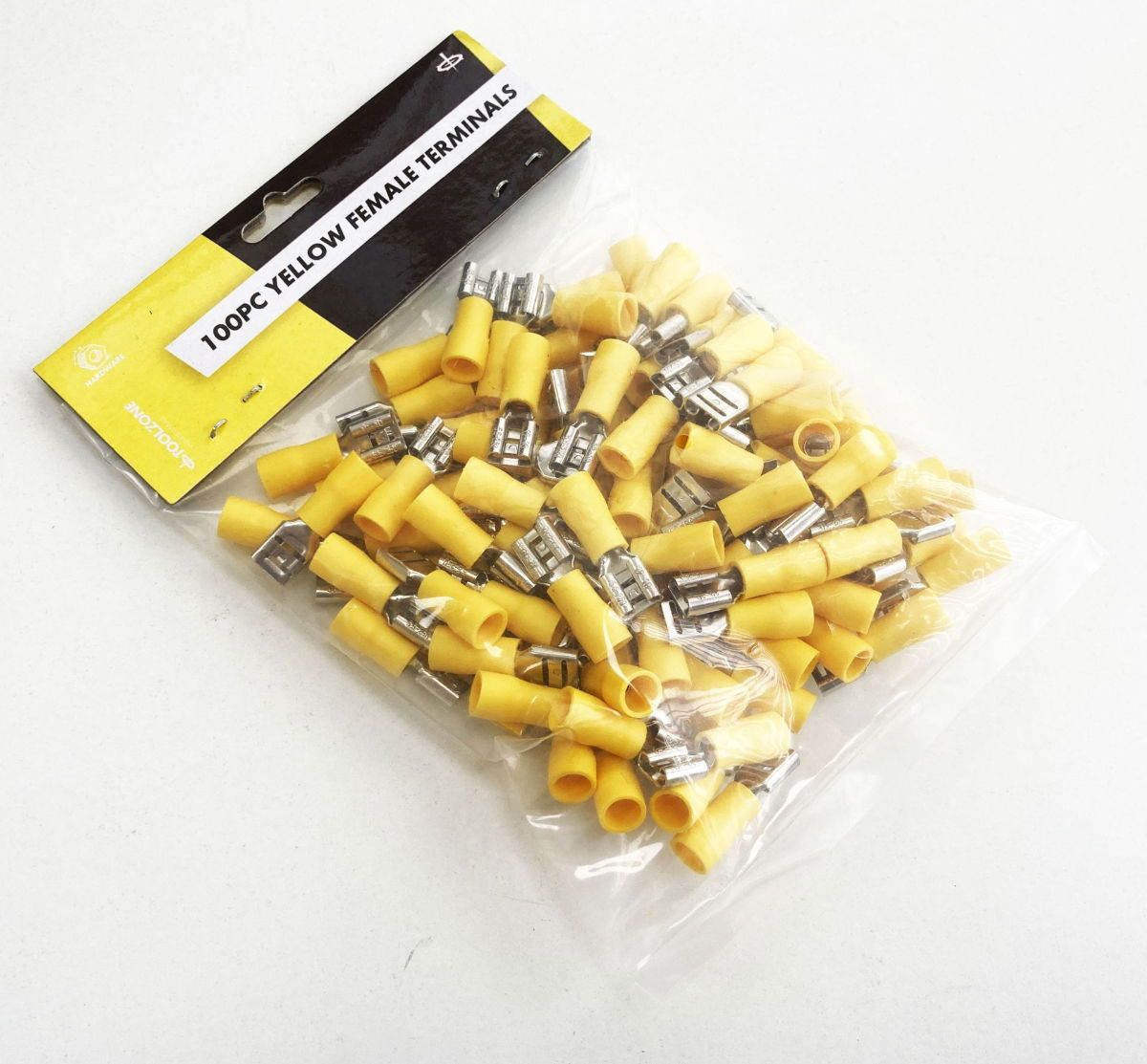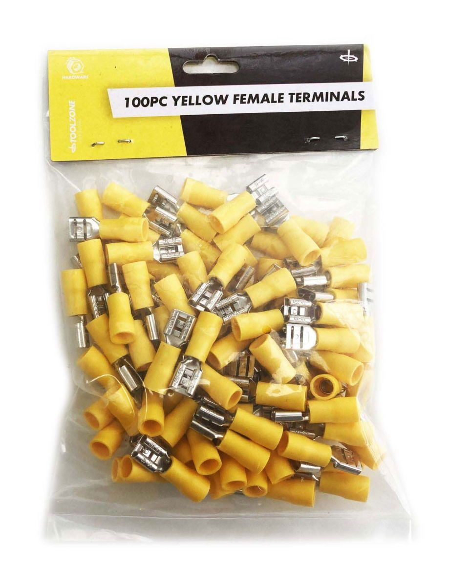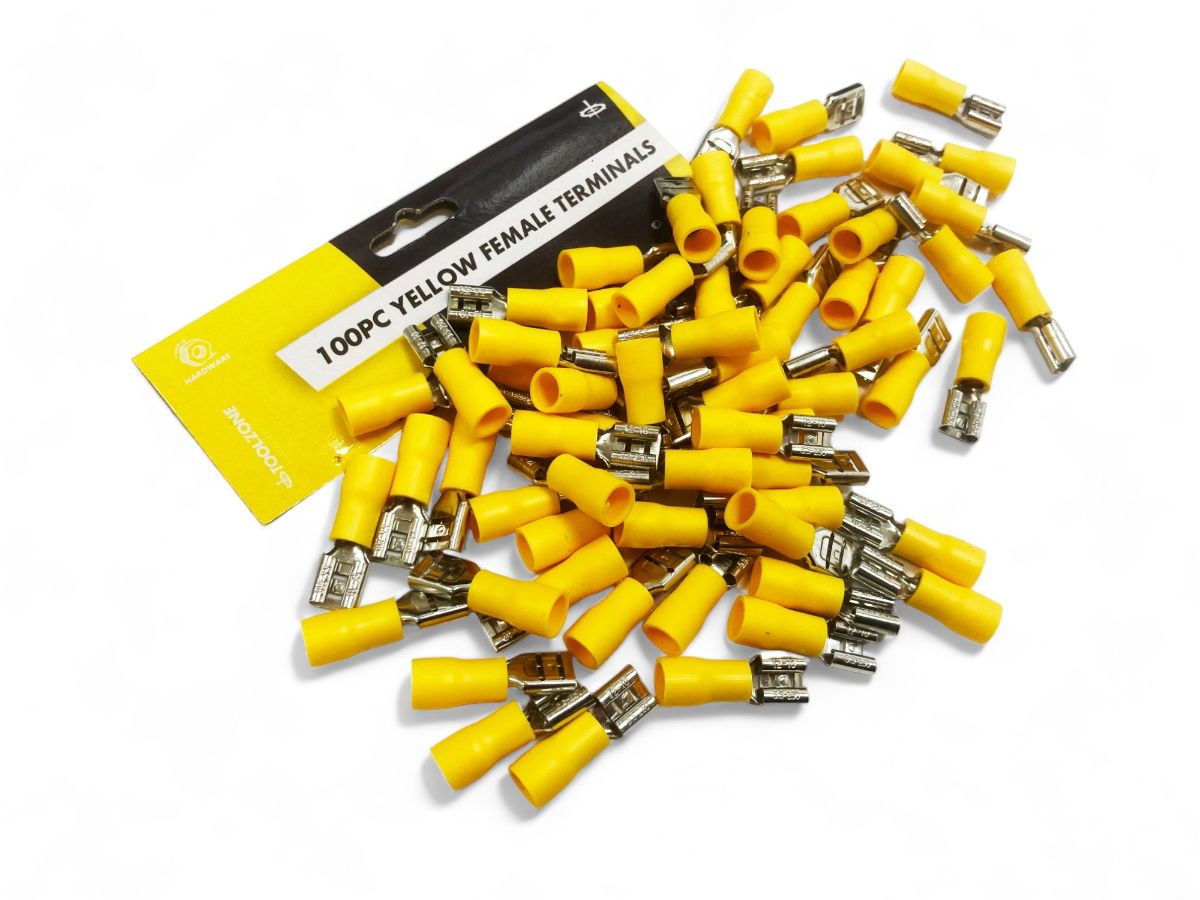FEMALE TERMINALS 100PC YELLOW SEMI INSULATED 12-10 awg 6.3mm x 0.4mm – TOOLZONE KDPEL141