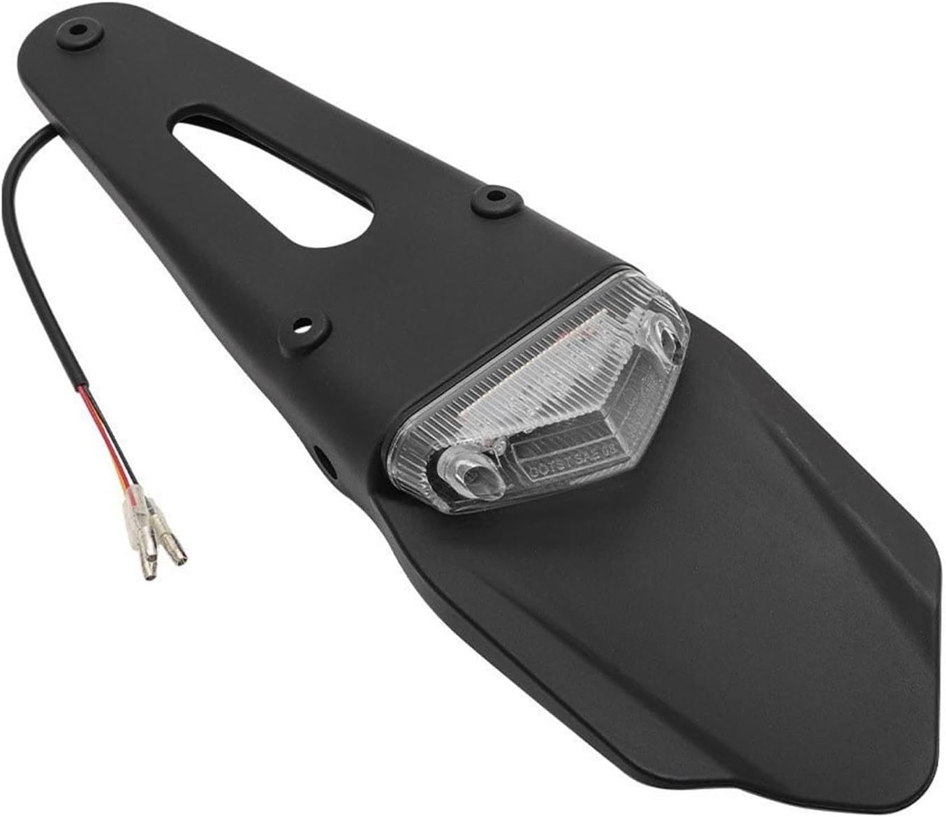 This bolt-on enduro extension with integrated LED lighting is a universal fitment suitable for installation under most MX or enduro rear fenders. It features a clear polycarbonate lens housing a 12V LED strip, providing both stop and tail light functions. The unit is constructed with durable materials and includes pre-drilled mounting holes. Wiring is managed through simple three-wire bullet and snap connectors. While easy to fit, minor modifications may be required during installation. Mounting hardware and installation instructions are not included.