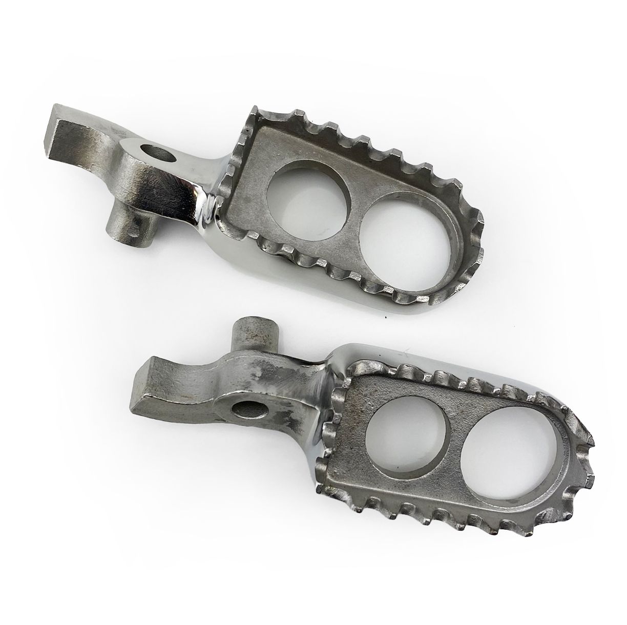 Feature extra wide foot area with deep cleets to keep you in control while putting less stress on a small portion of your foot. Large hole in the centre of the foot peg to eliminate mud / dirt build up. The design of the pegs give maximum strength for the lightest weight. Made from stainless steel so no more rusty pegs and fast spray jobs before the next event. 44mm Wide.