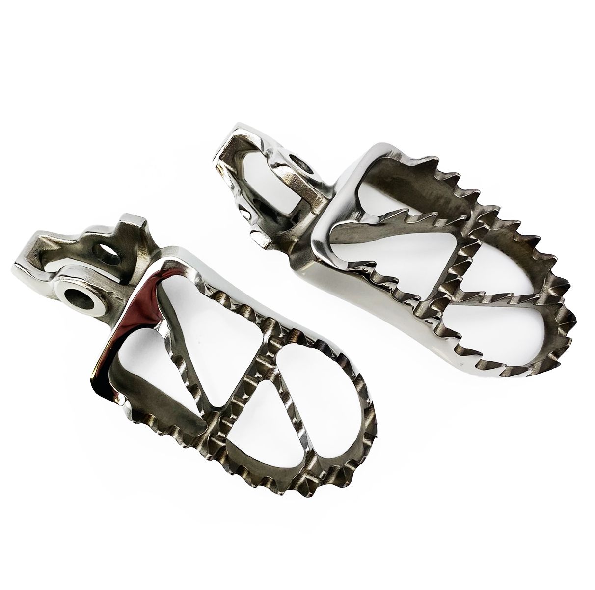 Feature extra wide foot area with deep cleets to keep you in control while putting less stress on a small portion of your foot. Large hole in the centre of the foot peg to eliminate mud / dirt build up. The design of the pegs give maximum strength for the lightest weight. Made from stainless steel so no more rusty pegs and fast spray jobs before the next event. 44mm Wide.