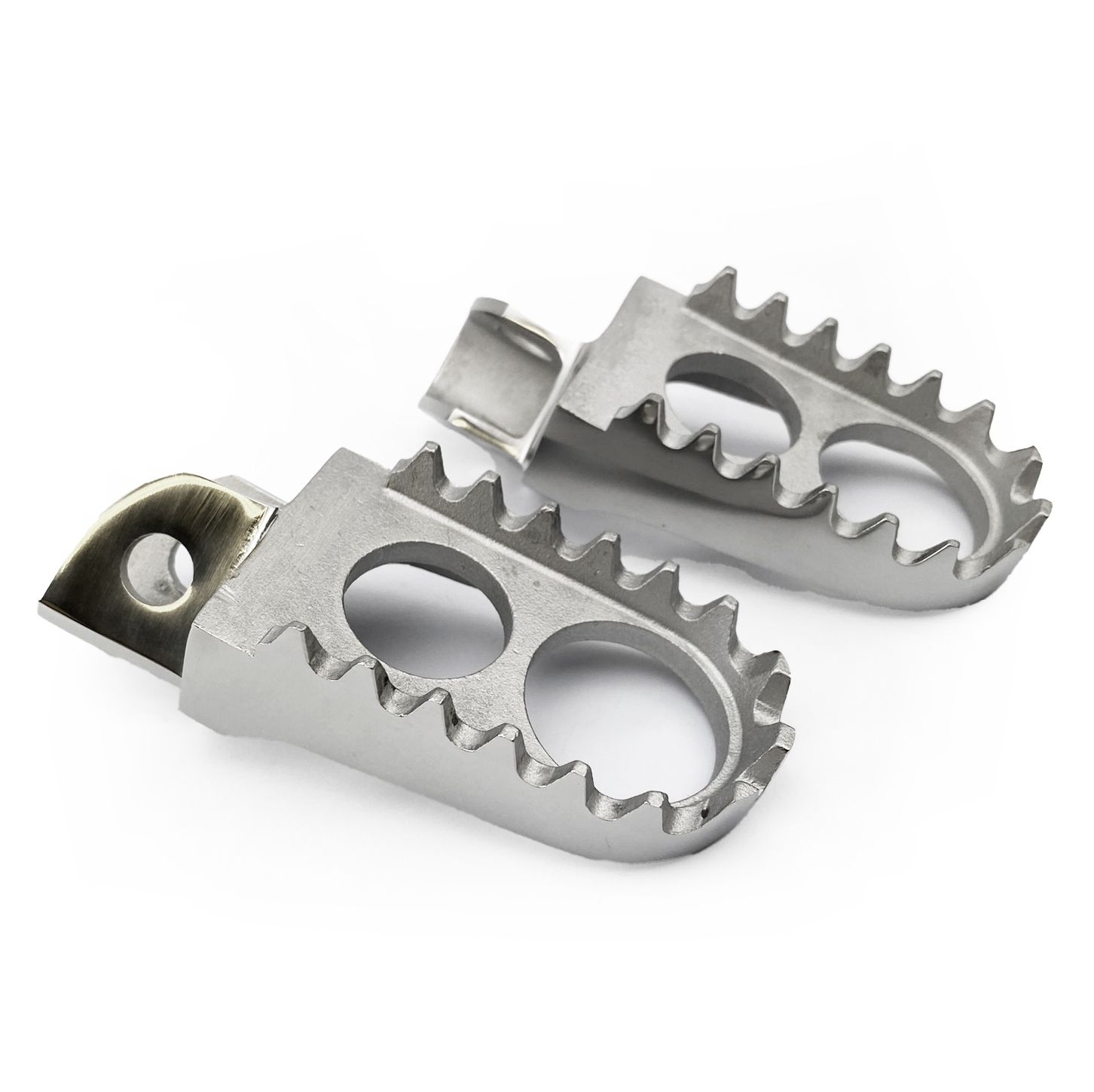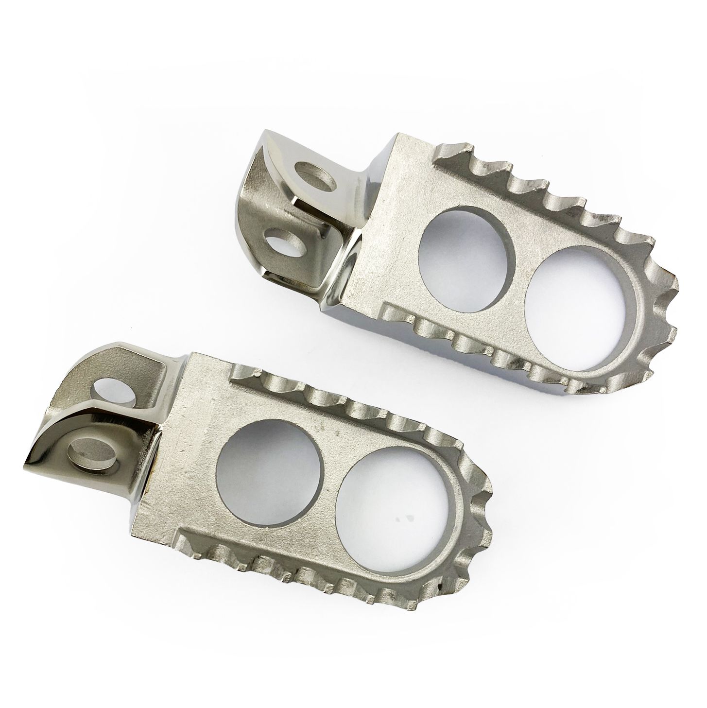 Feature extra wide foot area with deep cleets to keep you in control while putting less stress on a small portion of your foot. Large hole in the centre of the foot peg to eliminate mud / dirt build up. The design of the pegs give maximum strength for the lightest weight. Made from stainless steel so no more rusty pegs and fast spray jobs before the next event. 44mm Wide.