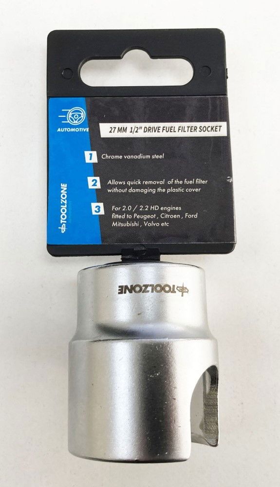 This 27 mm 1/2″ drive fuel filter socket is constructed from chrome vanadium steel and is designed to enable quick removal of fuel filters without damaging plastic covers. It is suitable for 2.0 and 2.2 HD engines and can also be used for removing oil filter housings on vehicles such as Ford, Peugeot, Citroen, and Volvo. Package dimensions are 11 x 5 x 4 cm.