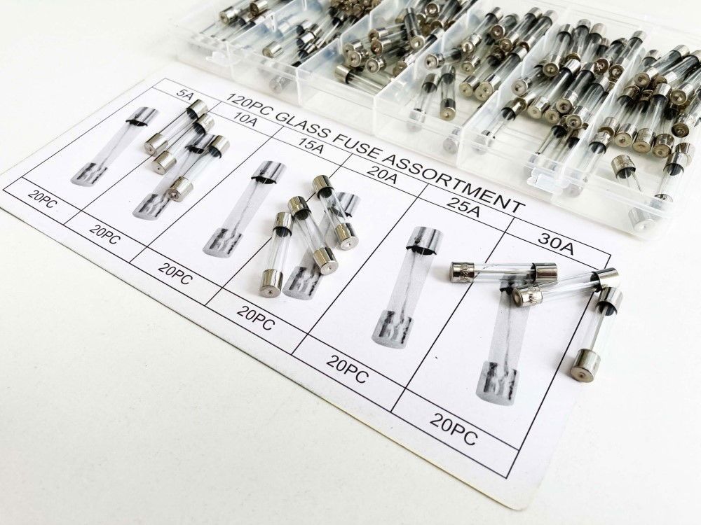 This 120-piece glass fuse assortment includes a range of commonly used amperages for various electrical applications. The fuses are 6×30 mm in size and are organized in a strong poly storage case.