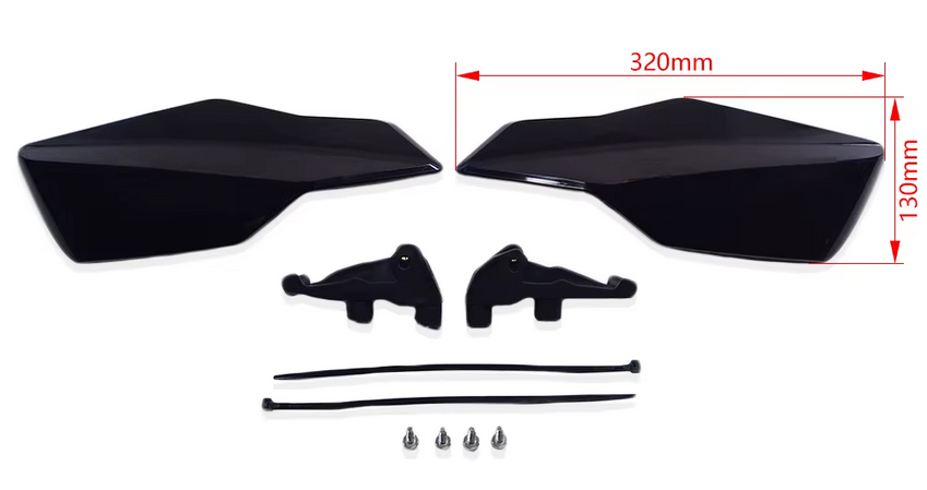 Black handguards designed for KTM, Husqvarna, and GasGas off-road motorcycles, offering a lightweight and durable construction. The open design ensures minimal weight while providing essential protection. These handguards mount directly to the levers using a special bracket and are available in three configurations to fit different brake and clutch setups.