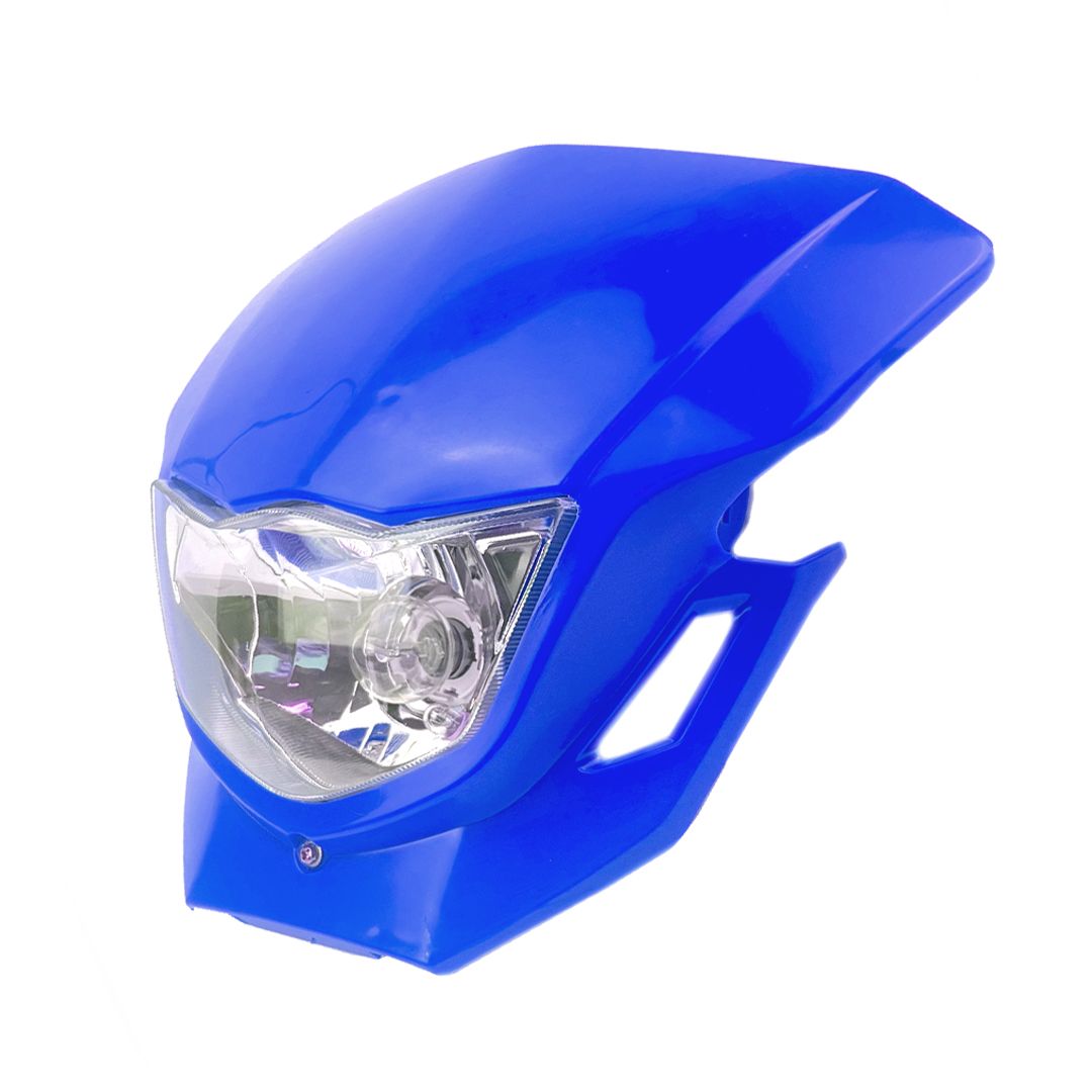This blue universal dirt bike headlight is designed for off-road use and includes a Bosh BA20D 12V 35/35W main bulb along with an additional side light bulb. The headlamp features an adjustable beam height from the front. It is equipped with a 4-pin female square socket and standard wire colour coding for simple installation.