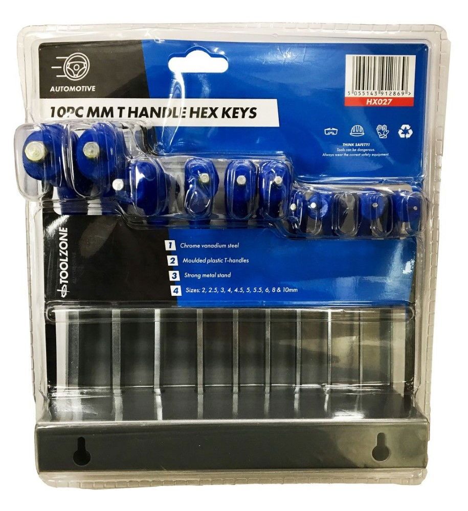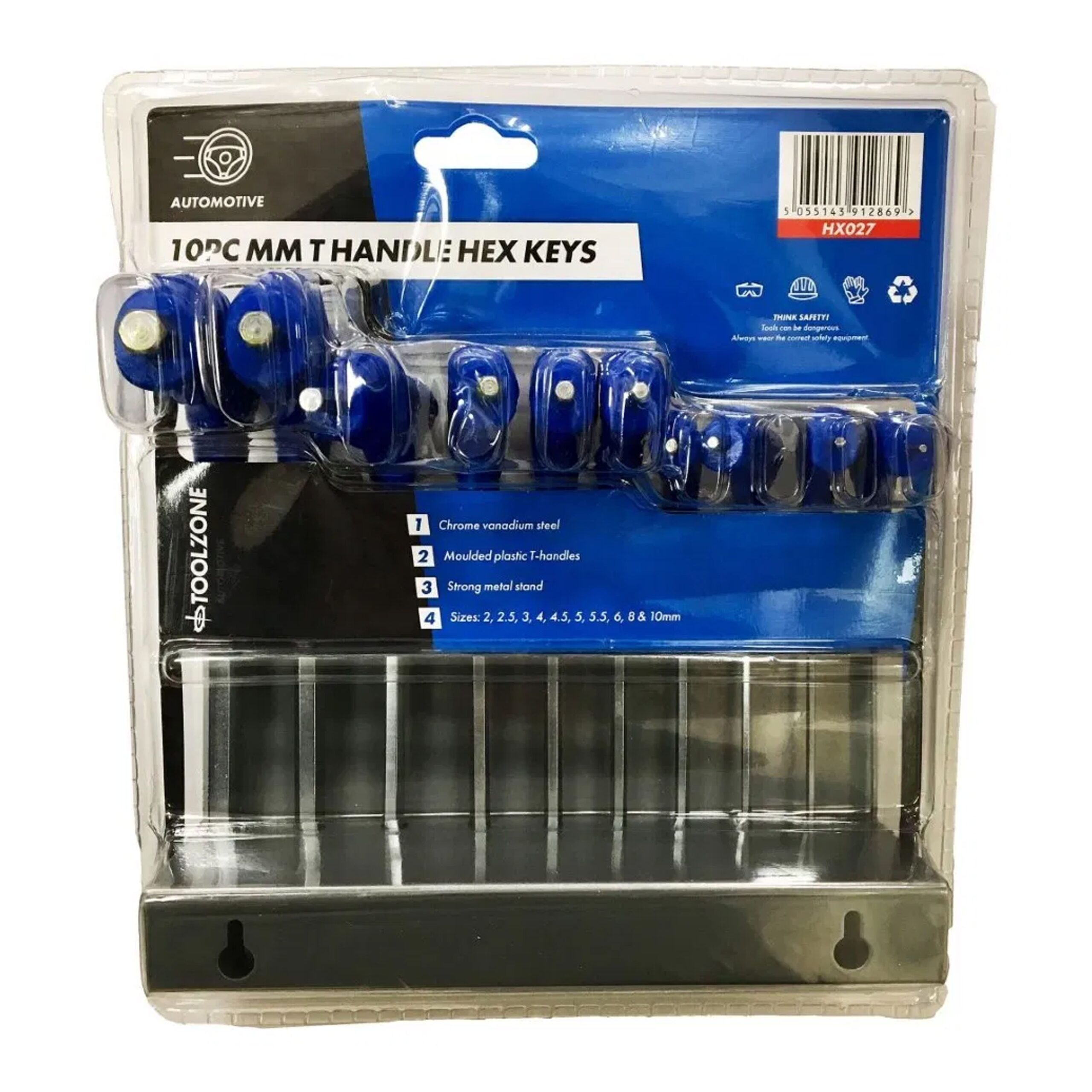 This 10-piece metric T-handle hex key set is constructed from chrome vanadium steel. The T-handles are designed for increased traction and comfortable grip. The set is supplied in a free-standing steel organiser with mounting holes.