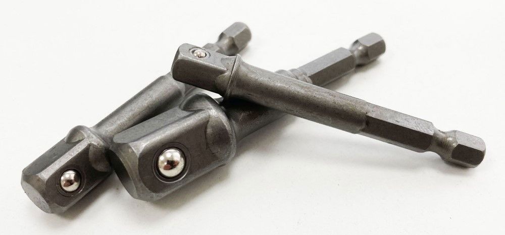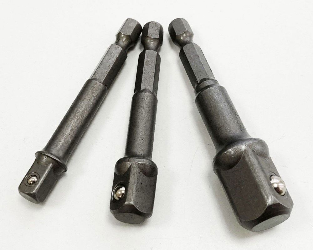 This 3-piece hex power adaptor set is made from chrome vanadium steel and is suitable for connecting sockets to power tools. The set includes adaptors in varying drive sizes and lengths.
