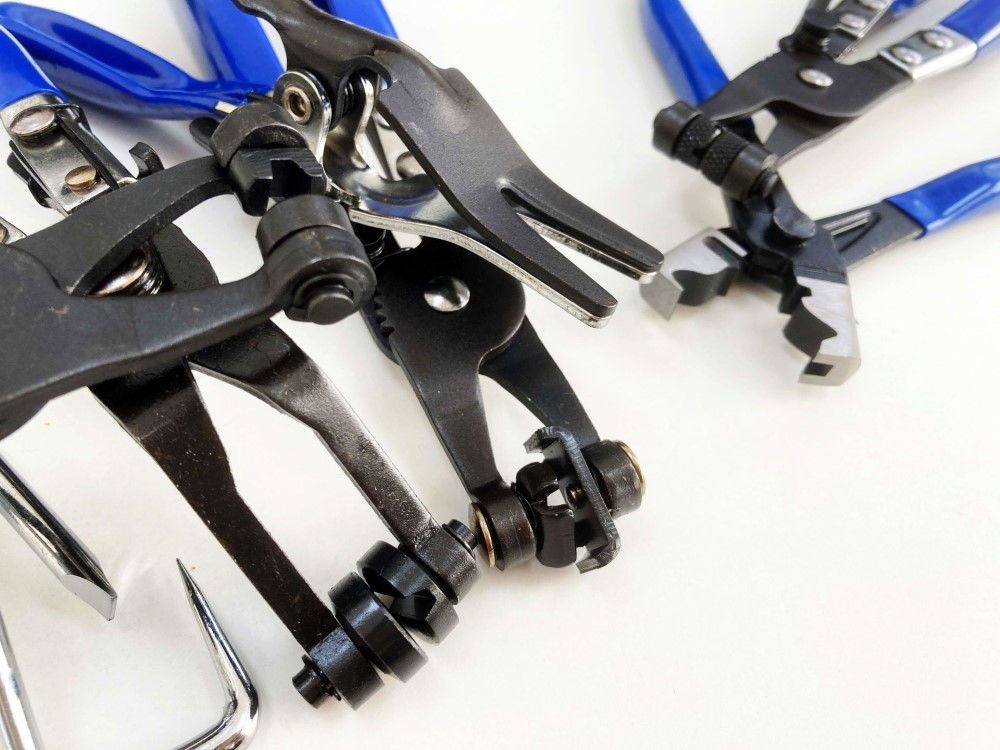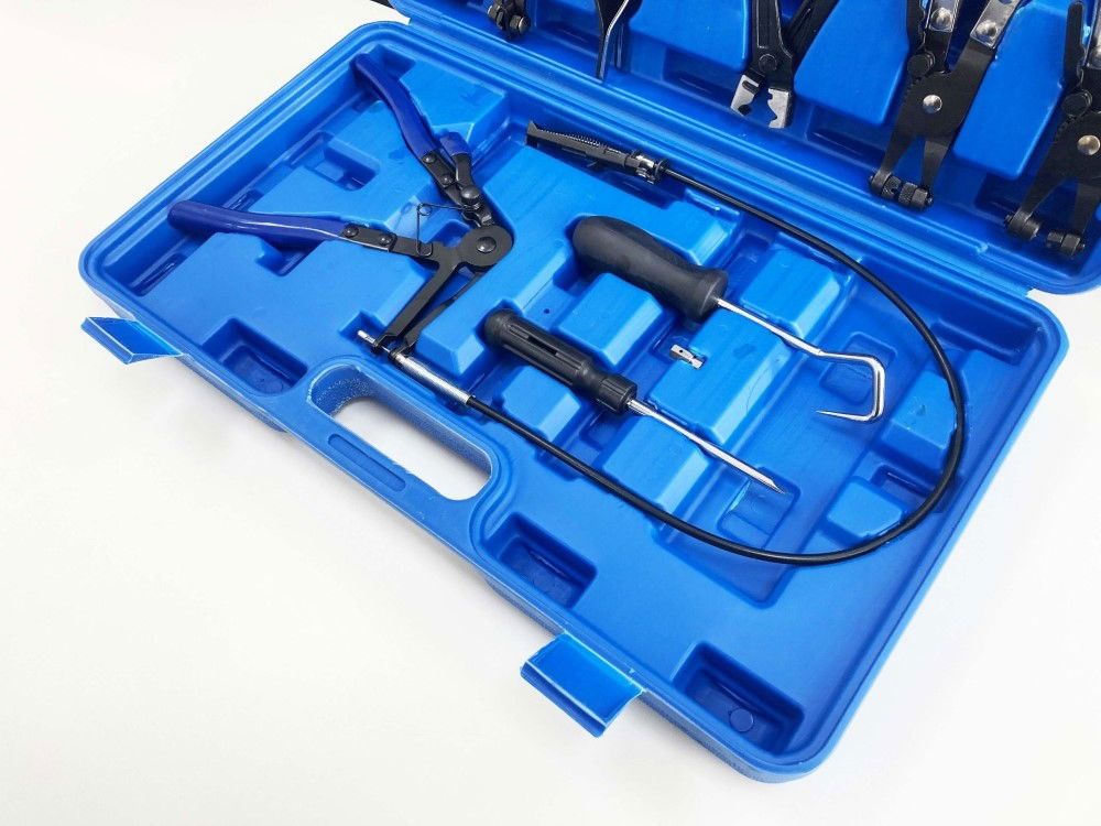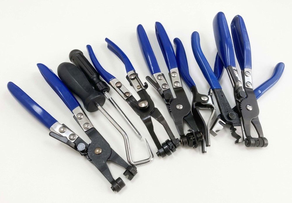 This 9 piece hose clamp plier set includes a range of pliers and tools designed for working with various hose clamps. The set provides specialized instruments for handling spring wire clips, band clips, Clic-r collars, and for hose removal. All tools are organized in a single set for convenience.