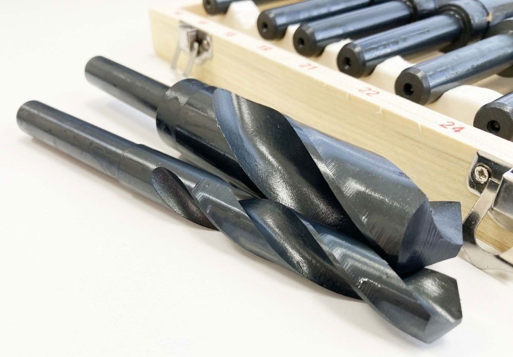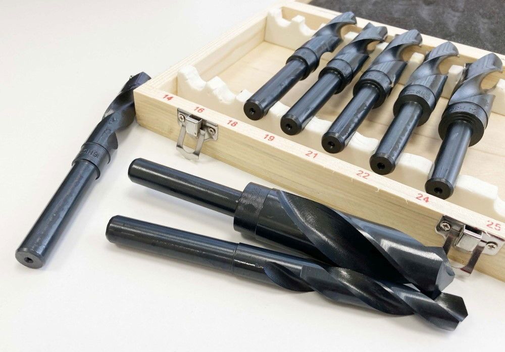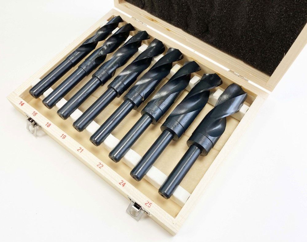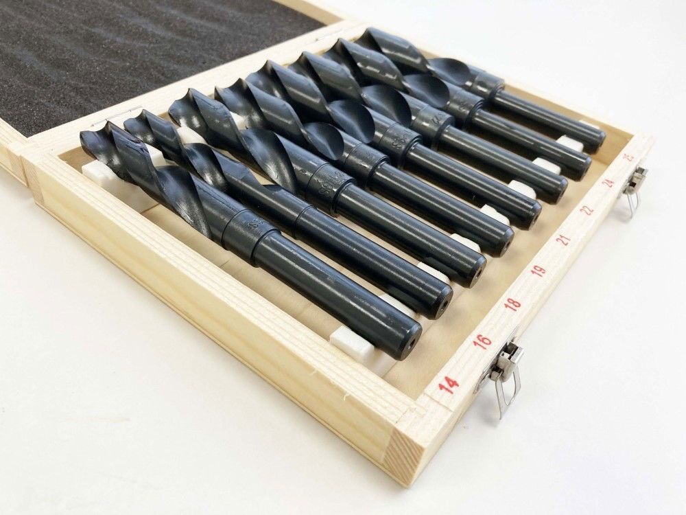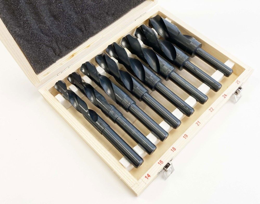 This eight-piece HSS drill set, also known as blacksmith drills, includes sizes ranging from 14 mm to 25 mm. The drills have a 1/2-inch shank and are made from heat-treated high speed steel. The set is supplied in a wooden storage box, and the package dimensions are 23 x 19 x 4.5 cm.