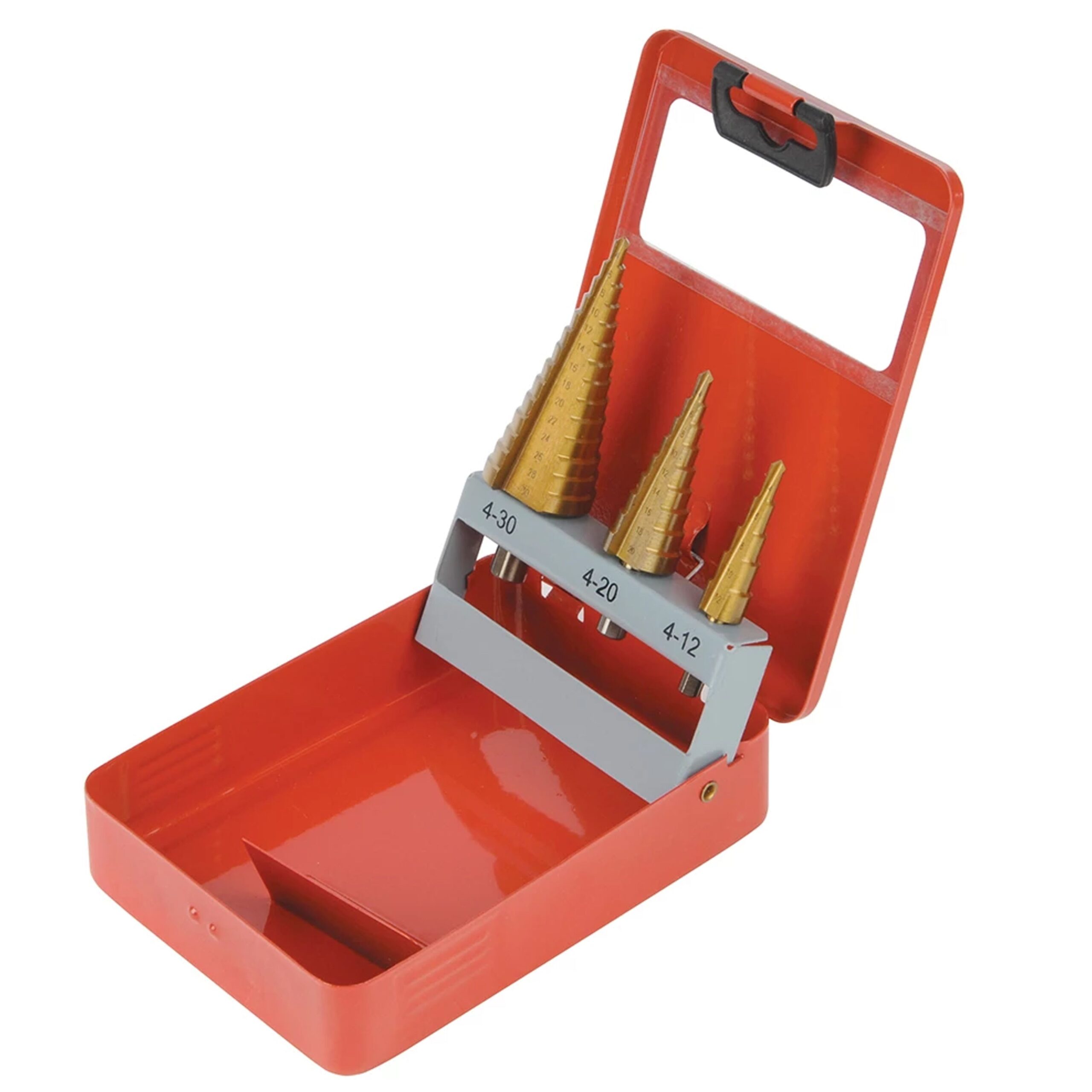 Self-starting step drills with storage case For precision drilling of sheet metals, alloys and plastics up to 4 mm thick Clearly marked 2 mm graduations 6, 8 and 10 mm shanks