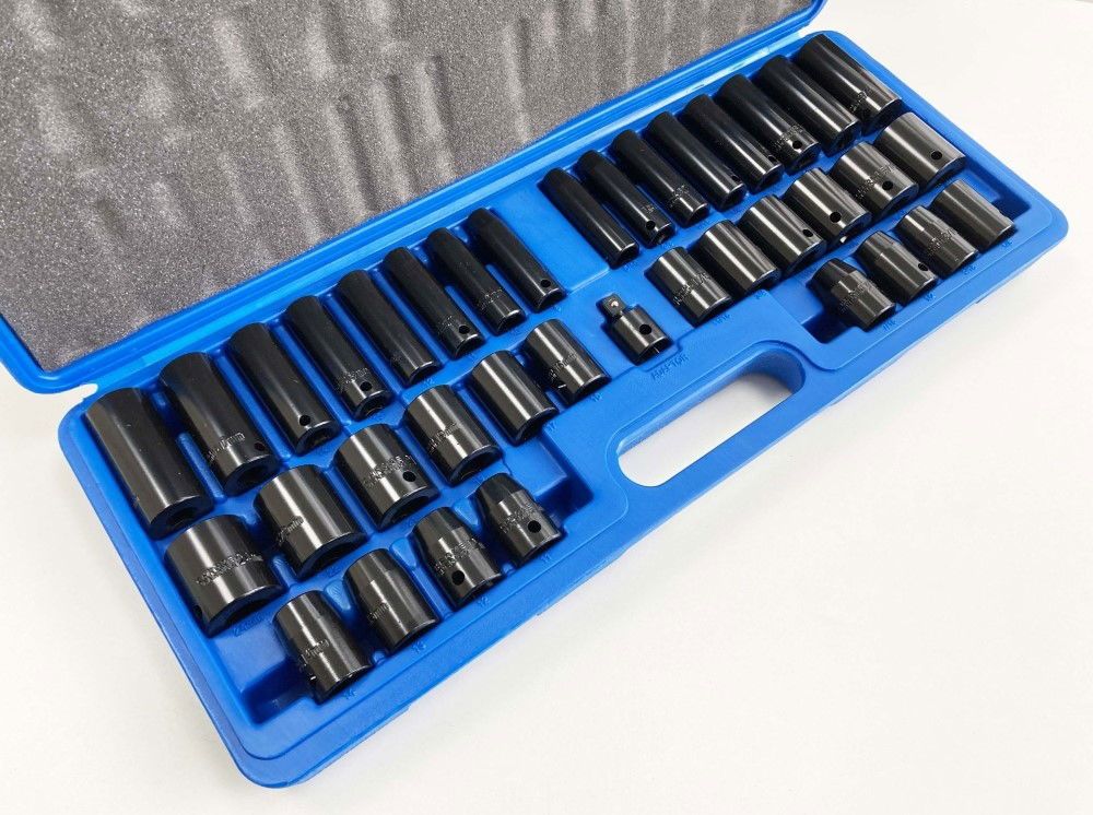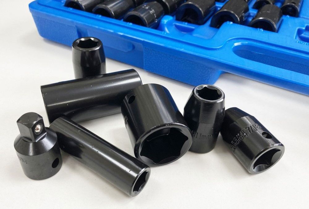 - 20 shallow impact sockets for 1/2″ drive: 11 mm (7/16″) to 24 mm (1″)