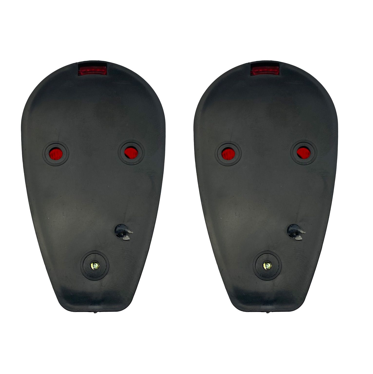 This pair of flush-fitting black indicators with red lenses is designed for trail and enduro bikes, providing a neat, tidy appearance and straightforward installation via 5 mm bolt holes for M4 screws with 28 mm centre-to-centre spacing.