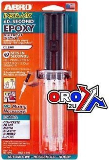 ABRO Insta-mix epoxy quick set. Special Insta-mix applicator mixes epoxy as it dispenses. Joins glass, concrete, metal & more. Clear epoxy sets in 60 seconds. Super high strength formula.