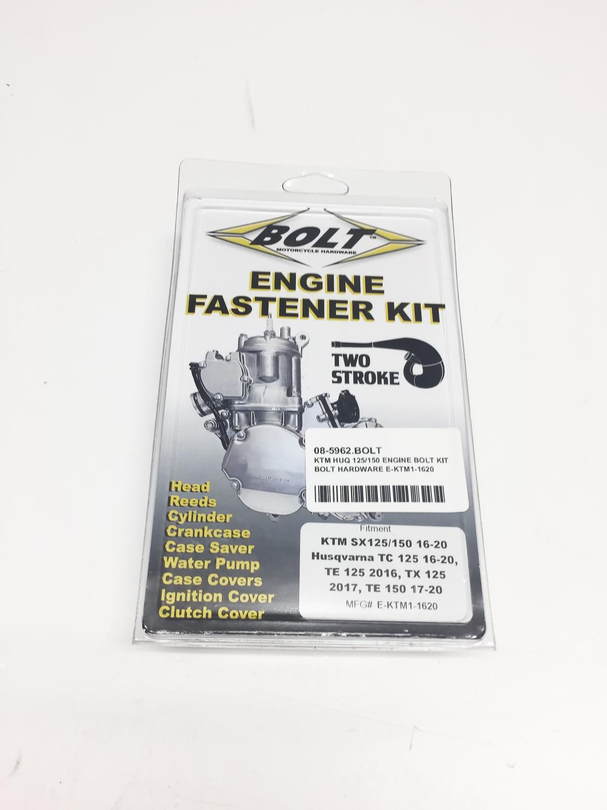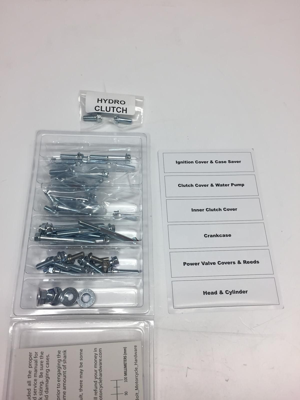 Two-Stroke Engine Fastener kits have all the external fasteners from top to bottom-end including hardware for: Heads, Reeds, Cylinder, Crankcase, Case Saver, Water Pump, Left Case Cover, Ignition Cover, Inner & Outer Clutch Covers, Power Valve Covers.