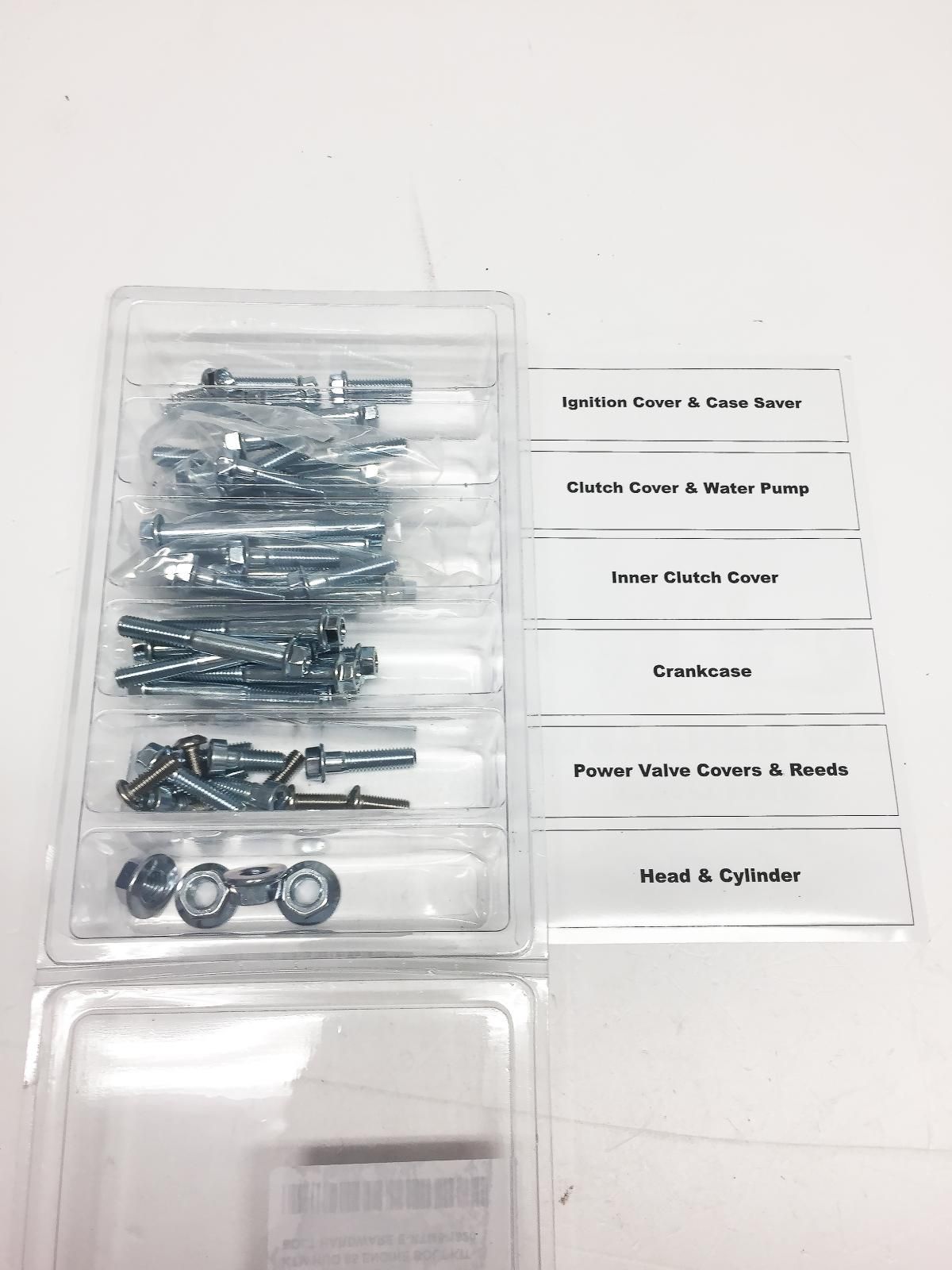 Two-Stroke Engine Fastener kits have all the external fasteners from top to bottom-end including hardware for: Heads, Reeds, Cylinder, Crankcase, Case Saver, Water Pump, Left Case Cover, Ignition Cover, Inner & Outer Clutch Covers, Power Valve Covers.