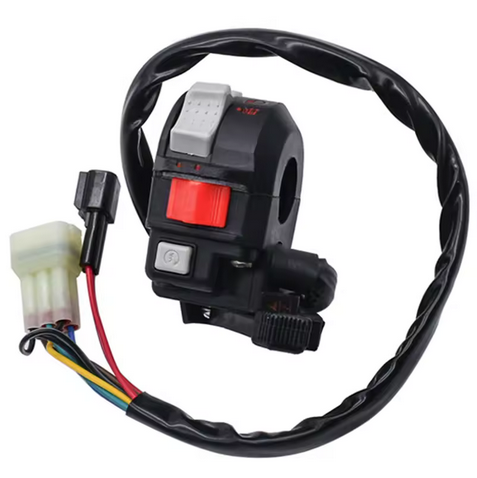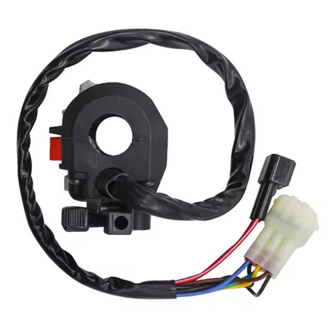 Left handlebar switch for Yamaha ATVs, designed as a direct OEM replacement. Provides essential controls, including engine start, engine run/off, headlight high/low/off, and choke lever. Manufactured to meet or exceed OEM quality standards for reliability and performance.