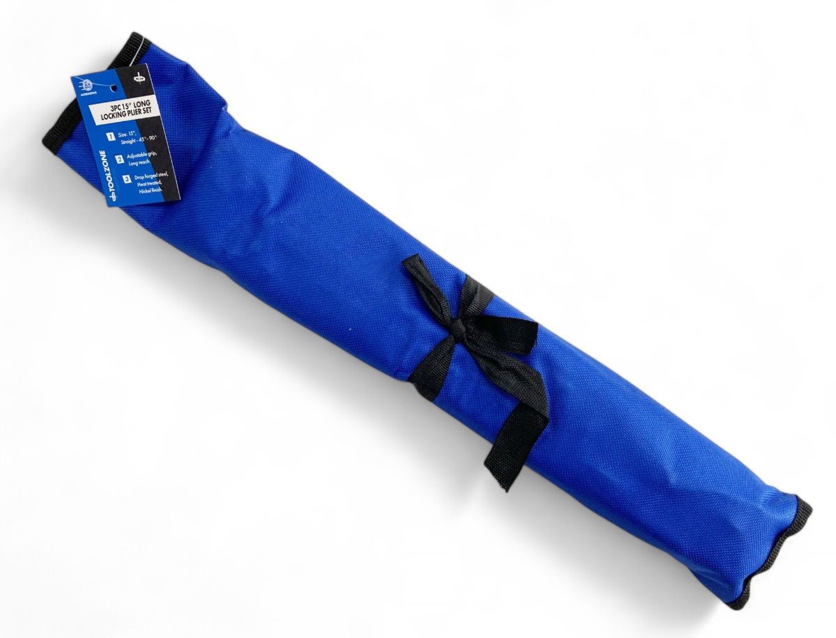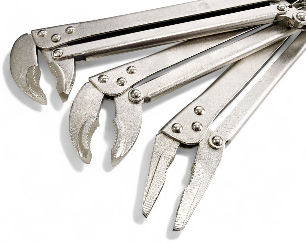This 3 piece locking plier set includes 15″ pliers in straight, 45 degree, and 90 degree configurations. Each tool is drop forged, heat treated, and features a nickel finish, with adjustable grip jaws for secure handling.