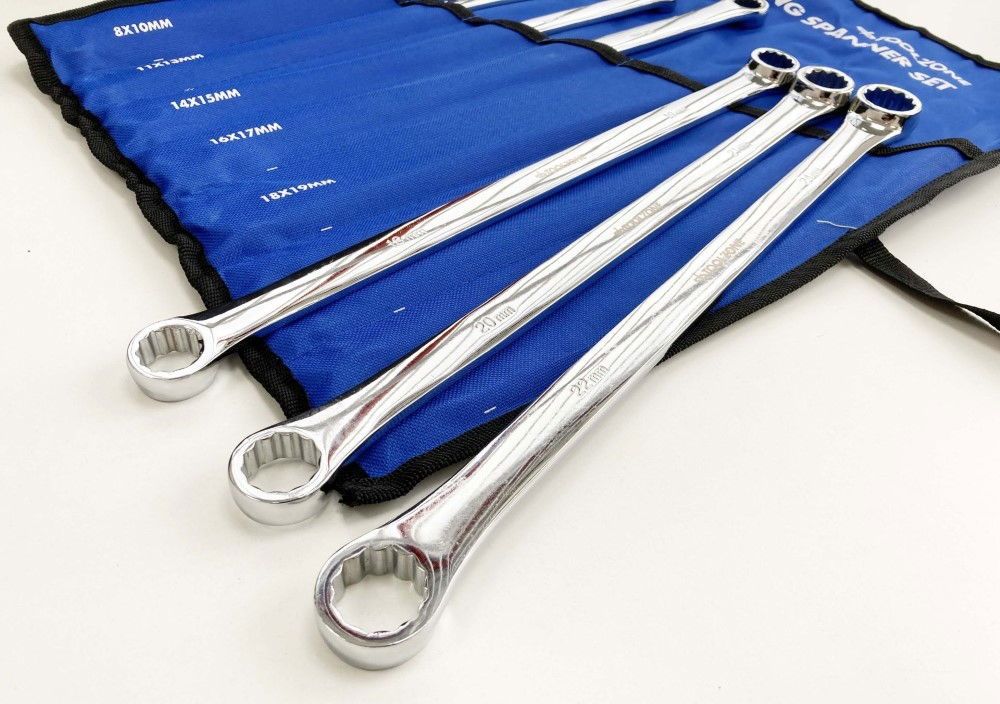 This 7-piece long ring spanner set covers a range of paired metric sizes from 8 x 10 mm to 22 x 24 mm. Manufactured from 50BV30 steel, the set is supplied in a quality storage pouch.