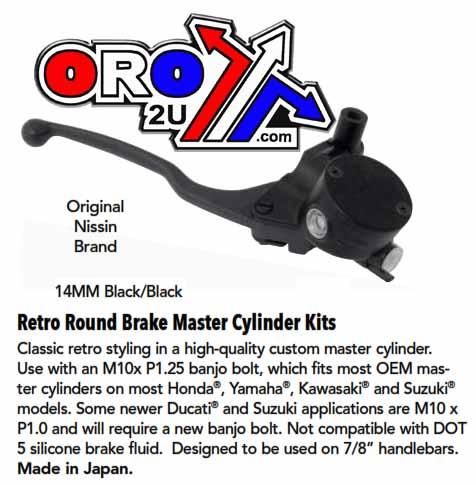 Classic retro styling in a high-quality custom master cylinder. Use with an M10x P1.25 banjo bolt, which fits most OEM master cylinders on most Honda, Yamaha , Kawasaki and Suzuki models. Some newer Ducati and Suzuki applications are