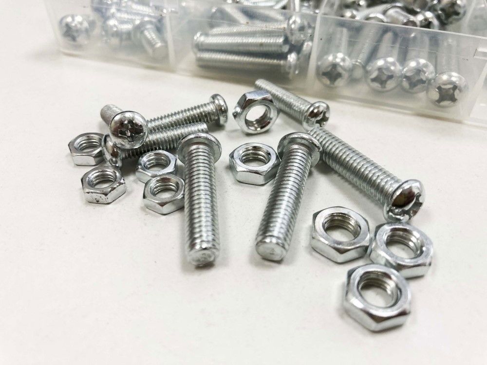 This 220-piece nuts and bolts assortment includes a range of Phillips head bolts and hexagonal nuts in commonly used sizes and lengths. The set is supplied in a strong poly storage case suitable for hanging and covers multiple fastening requirements.