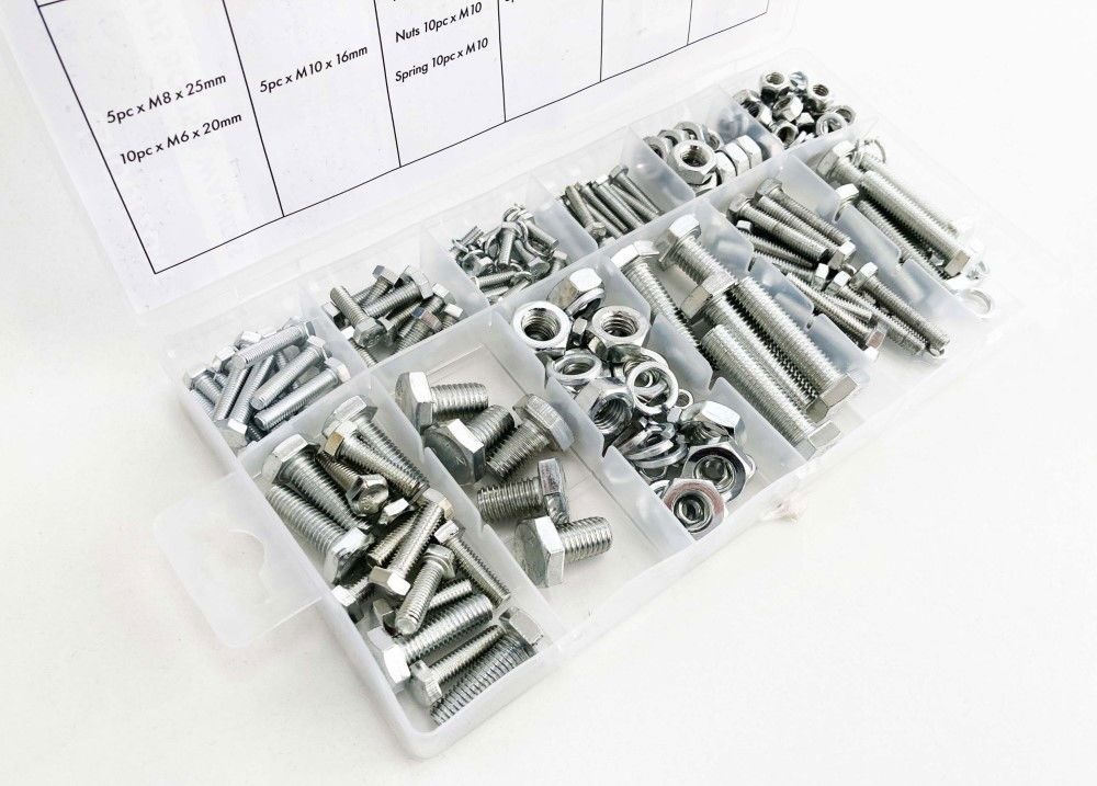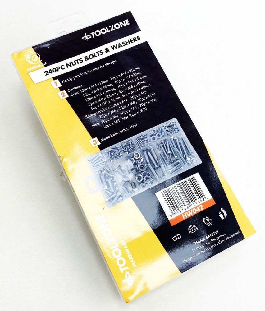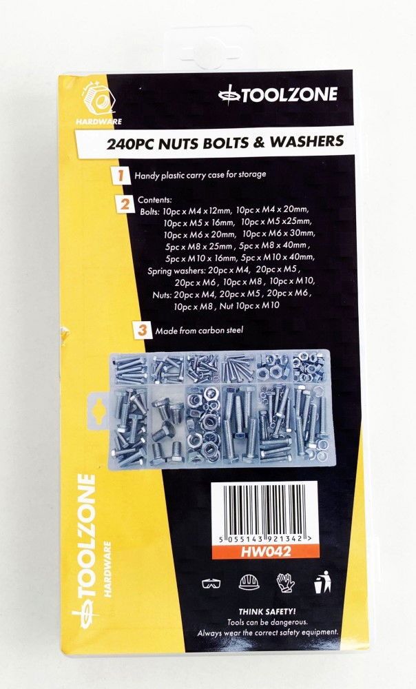 NUTS BOLTS AND WASHERS ASSORTMENT 240pc CARBON STEEL M4-M10 – TOOLZONE KDPHW042