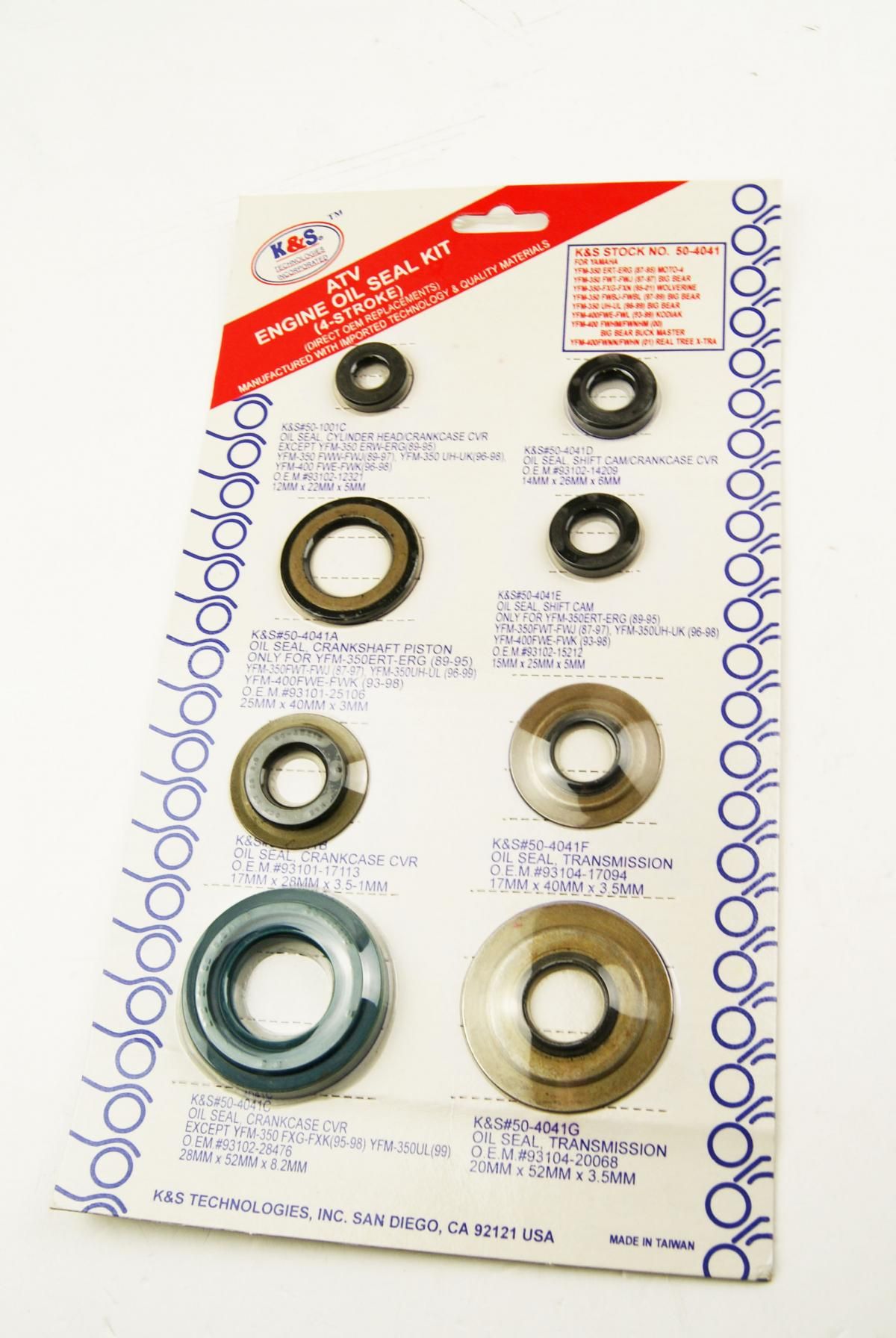 YFM-400FS-FV (04-06) Big Bear 4WD/Real Tree Xtra 4-S YFM-400 (06) YFM-40FBW/FBHW (07) Big Bear / Big Bear Hunter YFM-40FBX/FBHX (08) Big Bear 400 4WD YFM-40FS-FV (04-06) Big Bear 4WD/Real Tree Xtra 4-S This is a complete direct replacement kit from K&S Technologies, Inc. Includes all engine oil seals for a complete rebuild.
