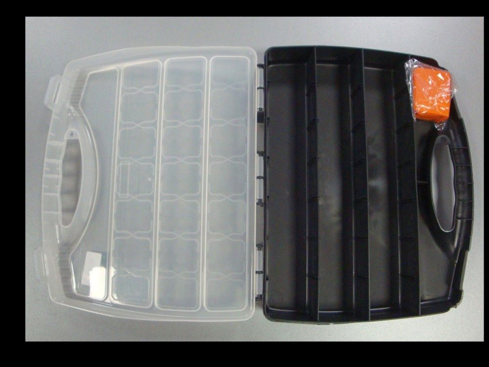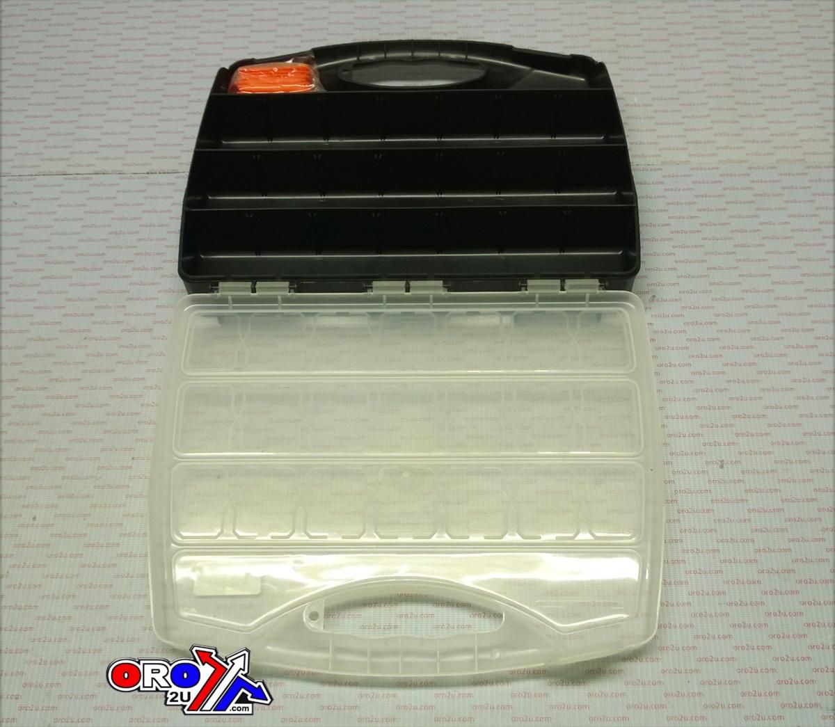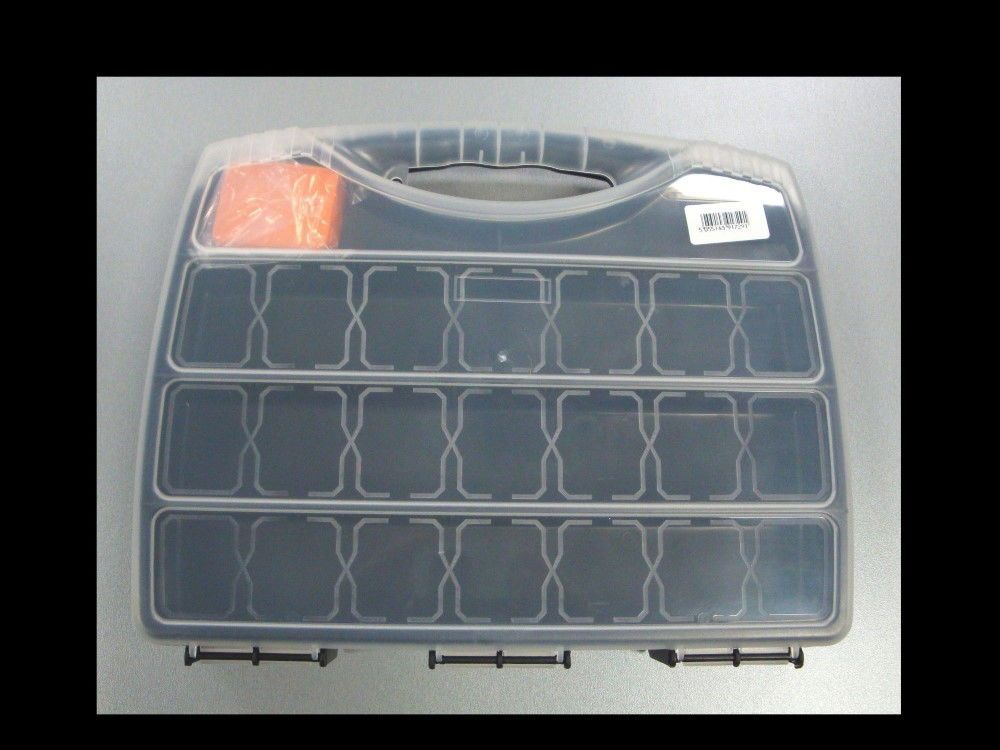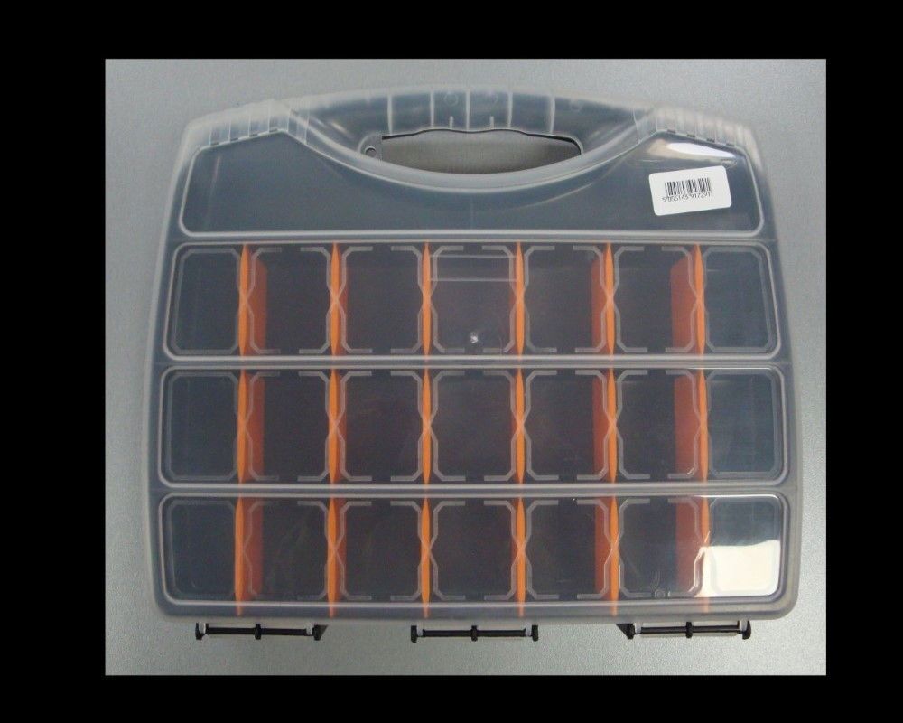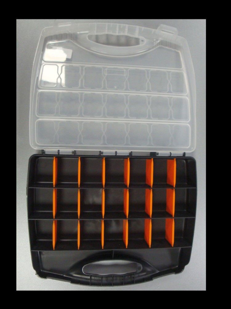 This 320mm organiser is constructed from durable black poly material and features a clear lid. It offers 22 storage sections with orange dividers and includes a strong moulded poly clasp system and a carry handle.