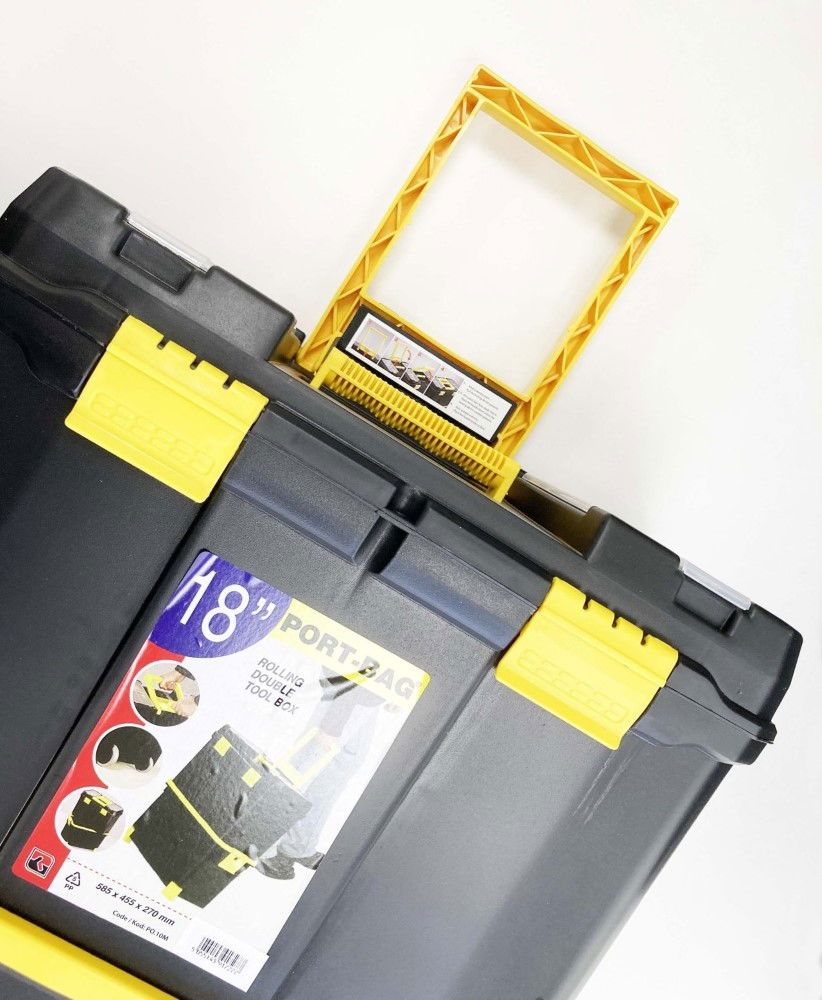 This 18″ mobile double box organiser features two clear fixed organiser sections integrated into the lid. It includes a large yellow carry tray inside the top box. The design has a retractable carry handle for a flat lid and a folding handle to facilitate transportation on wheels. The bottom toolbox locks securely onto the top section using heavy duty clasps. Package dimensions are 46 x 29 x 59 cm.